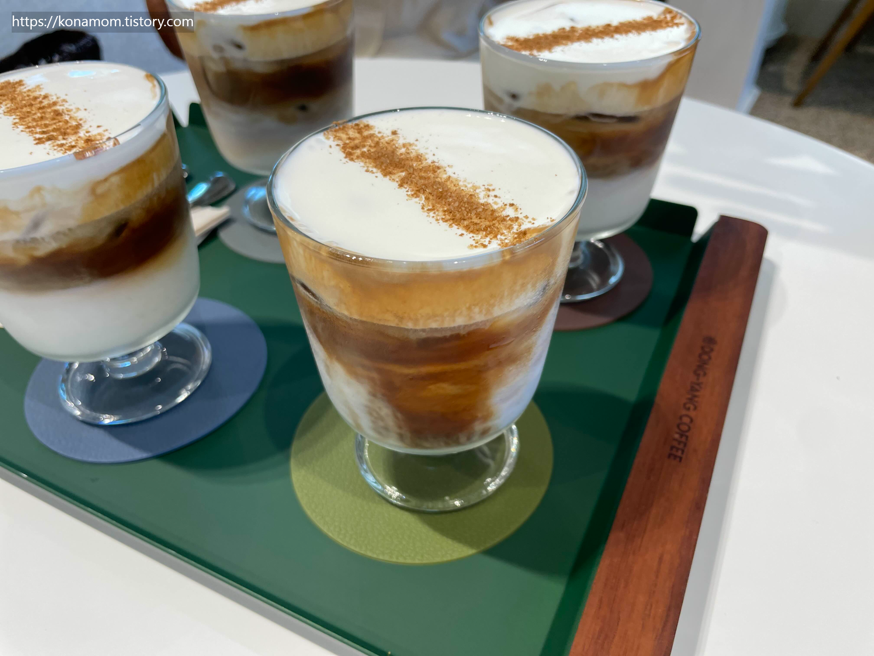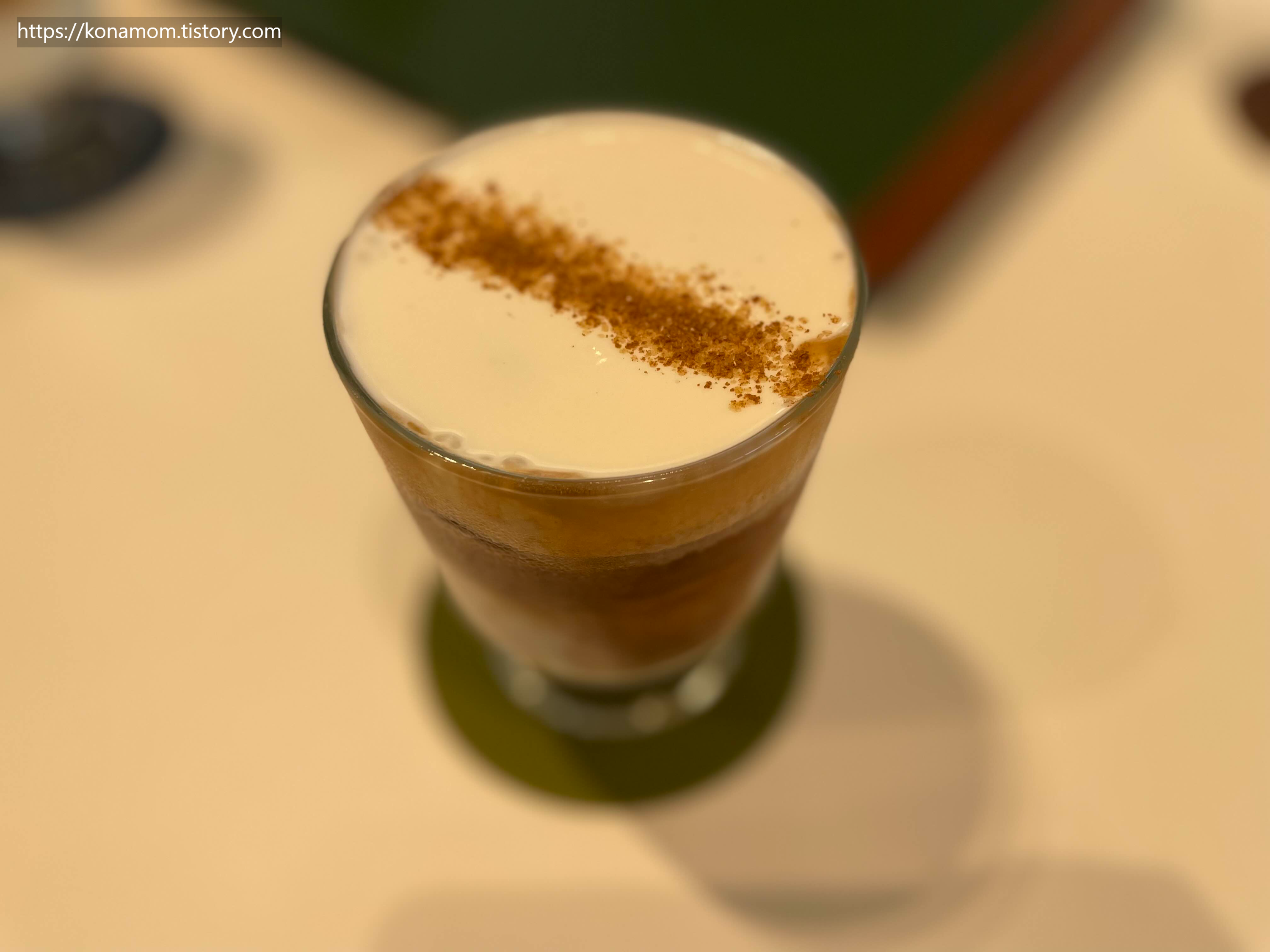맨 아래는 우유, 가운데는 커피, 위는 크림으로 처음에는 섞이지 않은 채로 마시다가 섞으면 부드럽고 고급진 단맛이 났습니다. 절친들 만나러 목감 갔다가 목감 새로  오픈한 인스타 감성 카페가 있다고 해서  가 봤는데, 카페 분위기도 커피 맛도! 주차까지도 마음에 들어서 조만간 또 갈 것 같습니다.