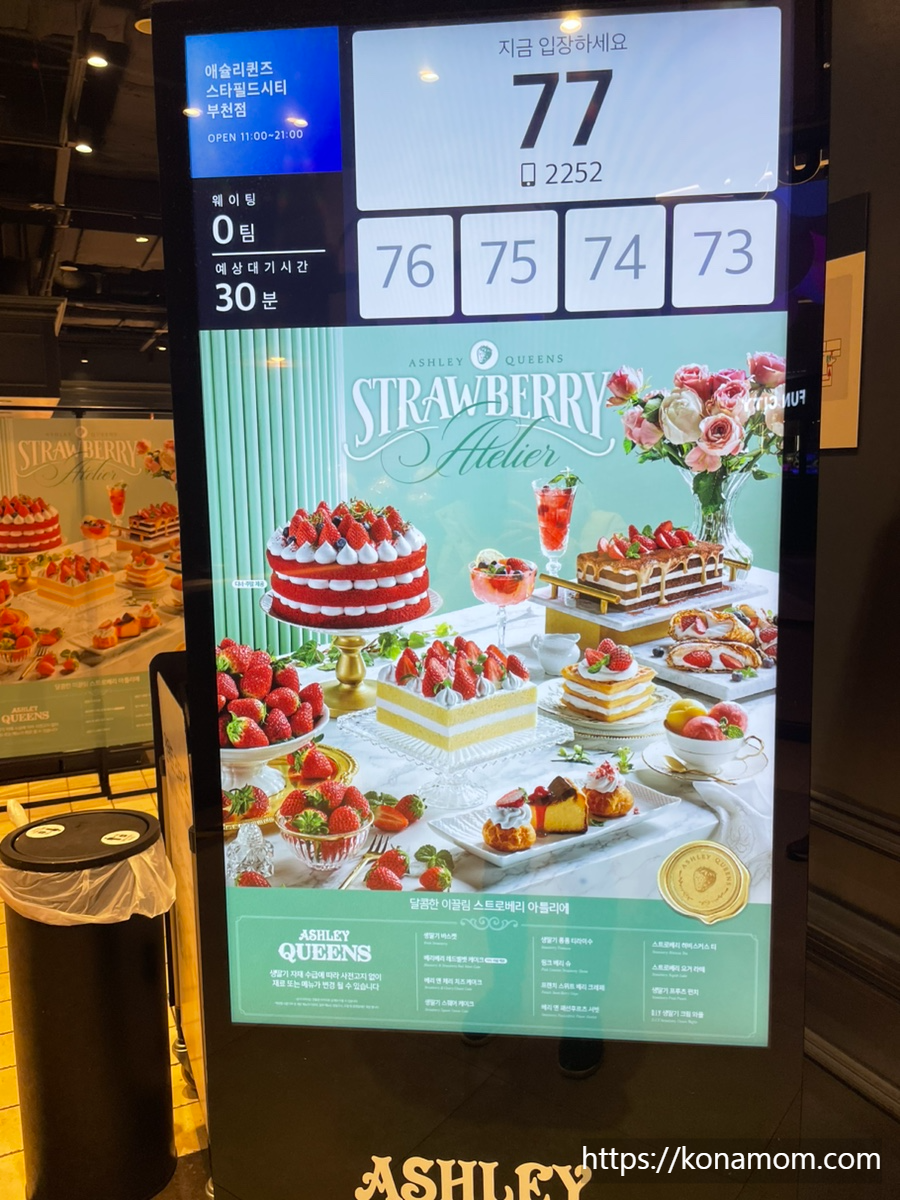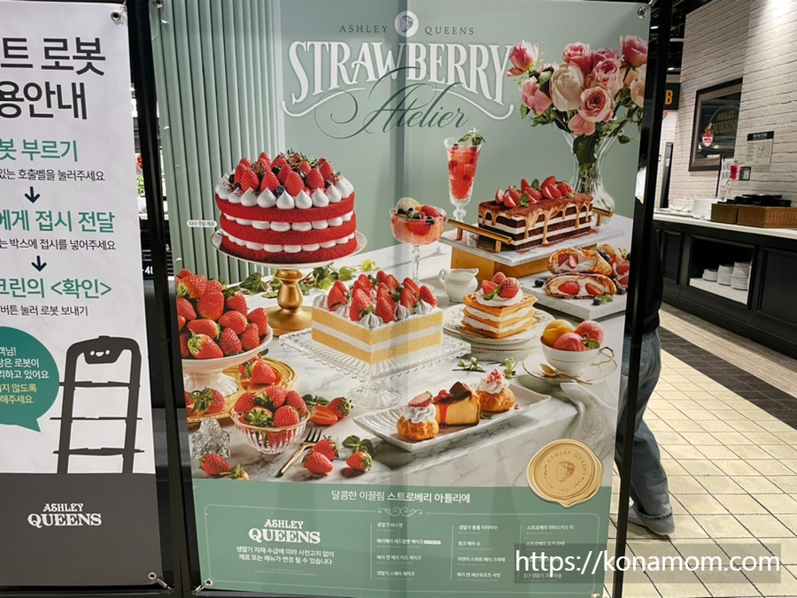 코나 졸업식이 있었던 날이에요. 졸업식이니만큼 코나가 먹고 싶은 메뉴로 먹으려고 물어봤더니 작년 제 생일에 다녀온 애슐리에 가고 싶다고 했어요. 마침 딸기시즌이라 애슐리 딸기 축제도 하고 있다고 해서 지난번에 다녀왔던 애슐리 퀸즈 스타필드시티 부천점으로 갔어요.