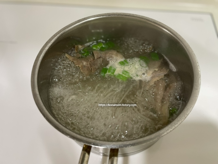 미리 불려둔 당면에 대파를 끓였습니다.
