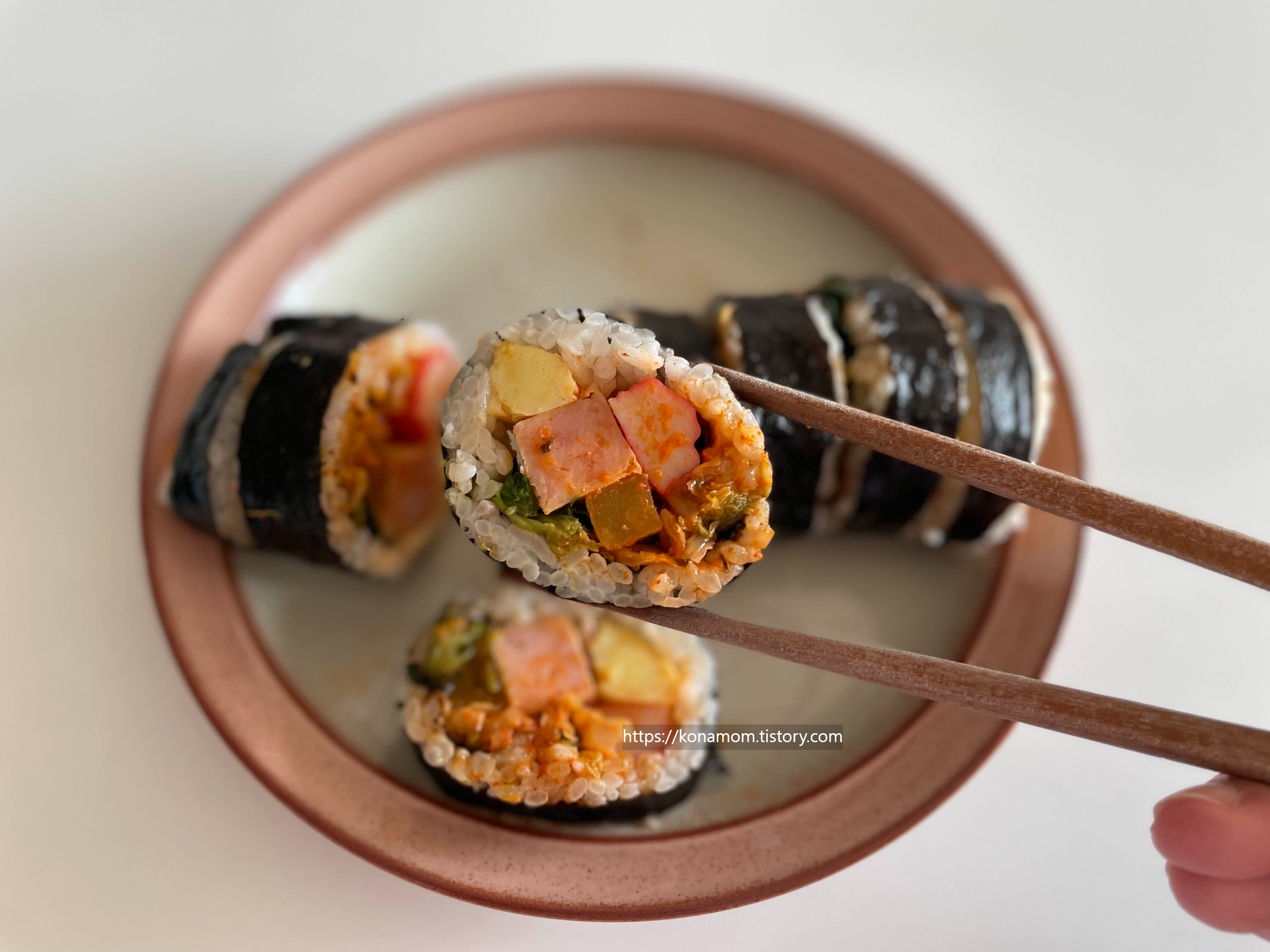 접시에 놓아보니 일반 분식집 김밥에서 구입한 것 같은 비주얼입니다.