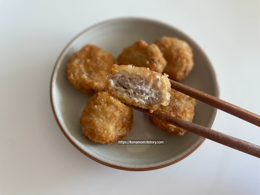 식당에 가지 않고 집에서 많은 기름을 써서 튀겨 먹기는 아무래도 어려운데, 이 컬리 미니돈까스는 에어프라이어에 했는데도 불구하고 바삭하고 고기도 두툼해서 아이 반찬으로 샀다가 어른반찬으로 이틀 만에 한 팩을 다 먹었습니다;;