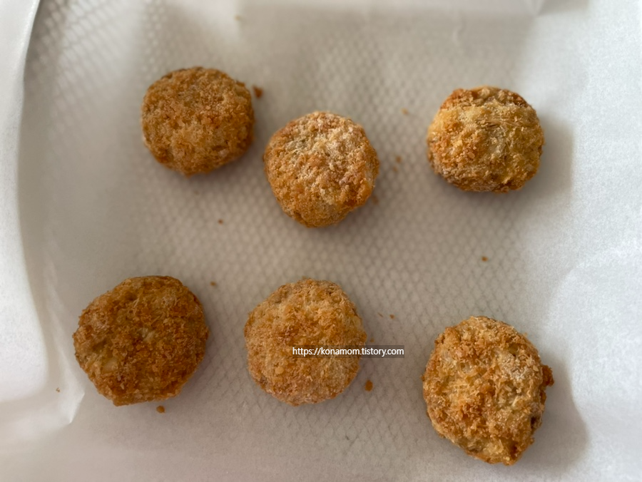 에어프라이어에 구워도 되고 프라이팬에 구워도 되는데, 에어프라이어용으로 나온 미니돈까스라 에어프라이어로 하시는 걸 추천합니다.