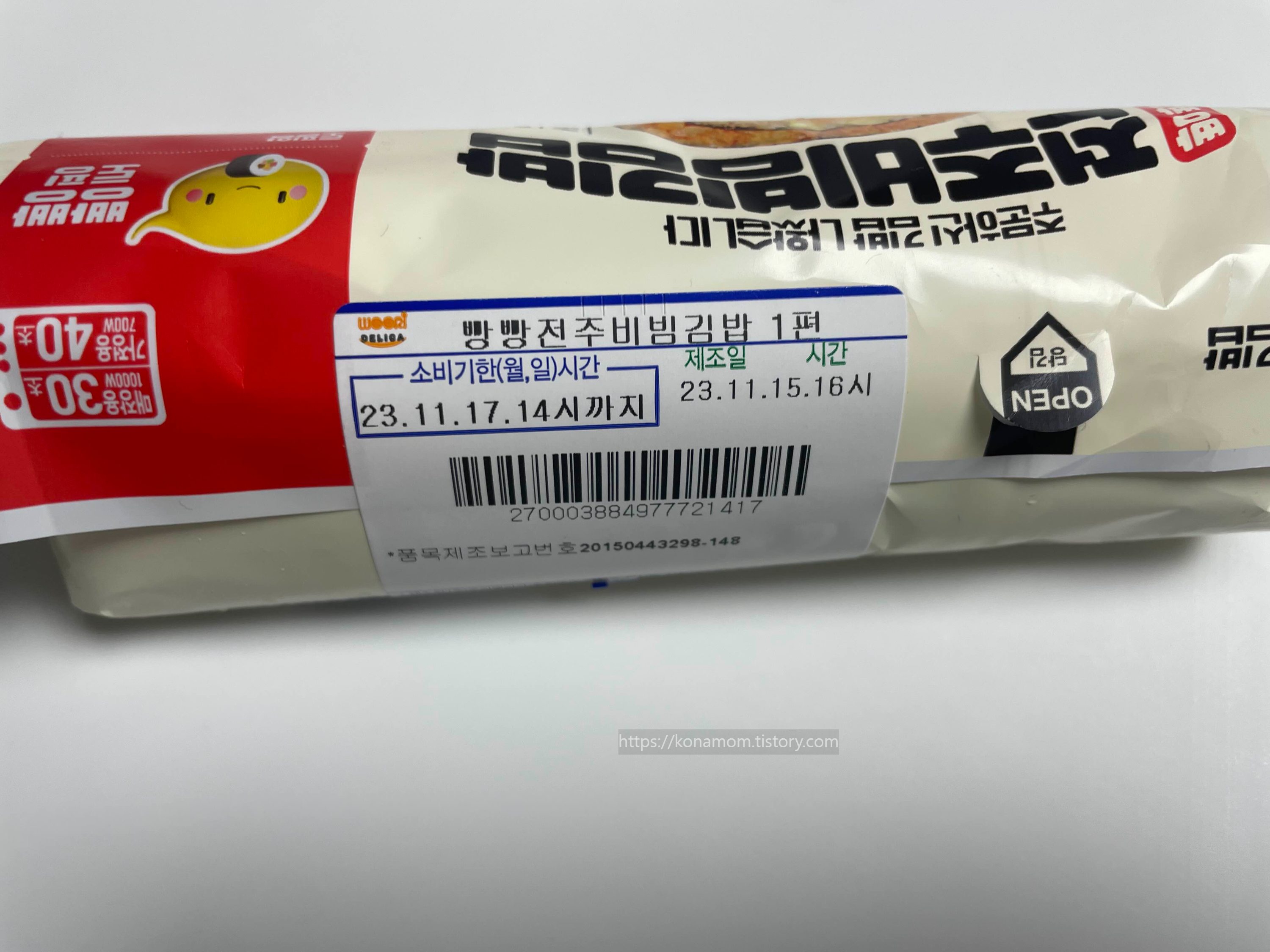 GS편의점 김밥 전주비빔밥김밥은 소비기한 제조일 표시가 보기 좋게 표기되어 있었습니다.