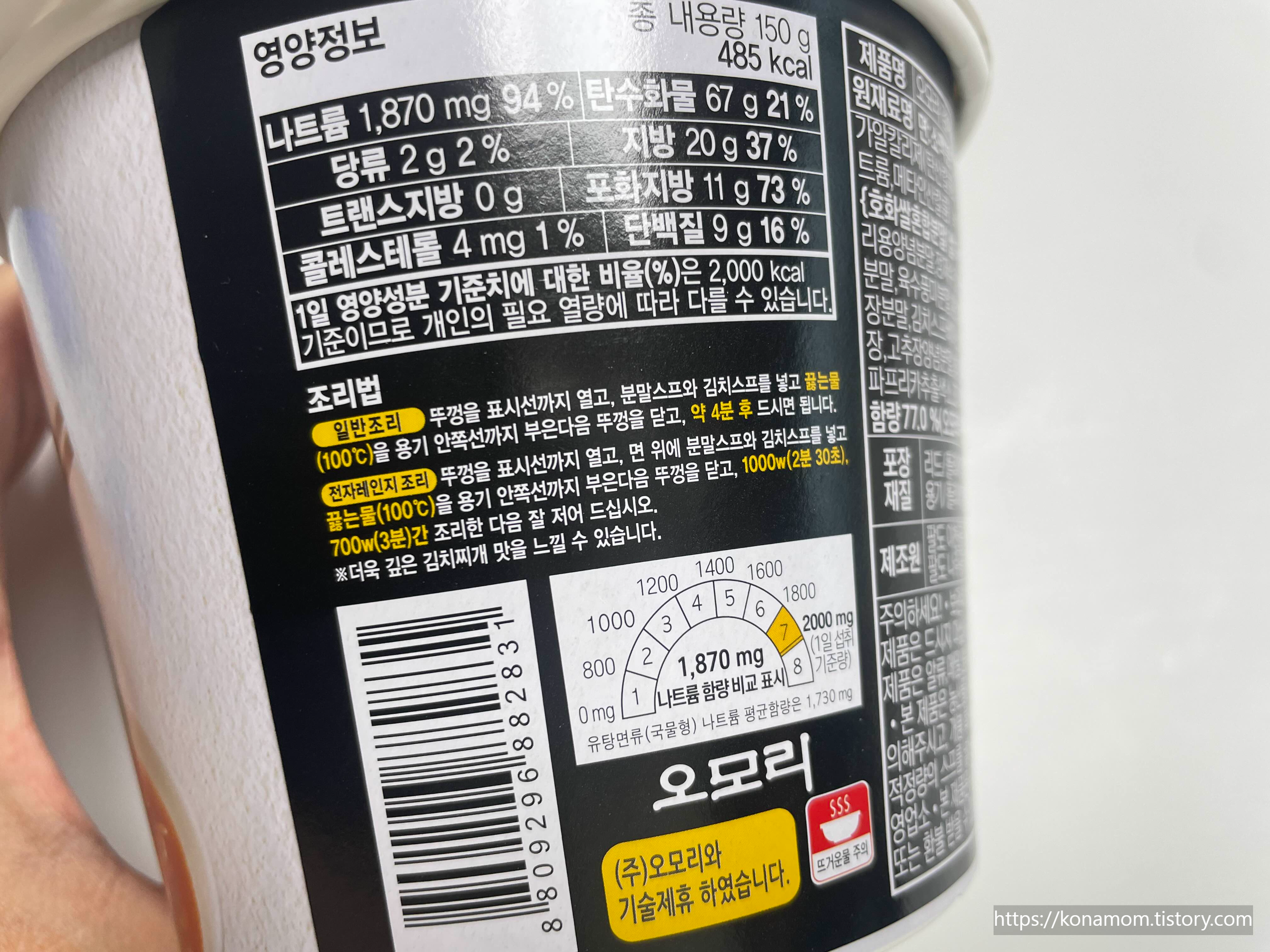 오모리 김치찌개라면은 칼로리 485kcal, 조리법은 일반 컵라면처럼 드셔도 되고 전자레인지 사용가능 용기라 전자레인지에 조리해서 드셔도 됩니다.