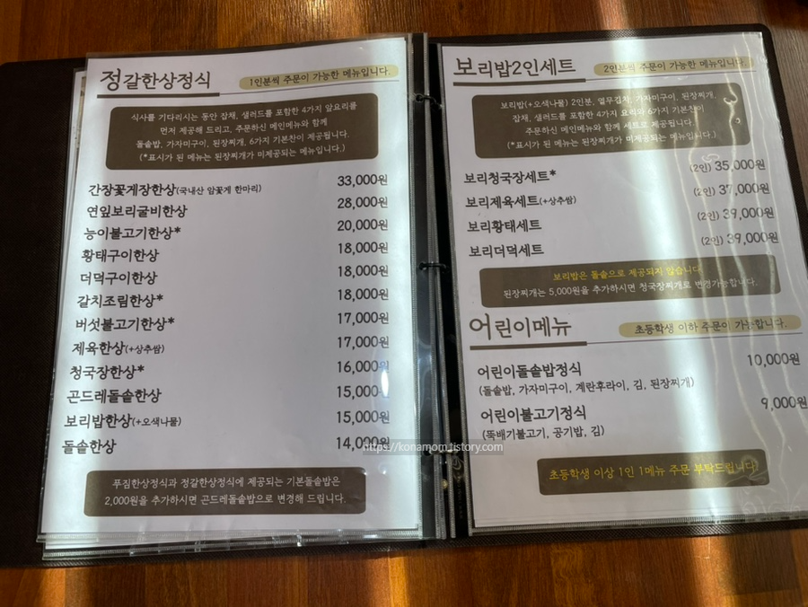 기본 한정식 메뉴로 1인분씩 주문이 가능한 메뉴들도 있었고 보리밥 좋아하시면 드실 수 있는 청국장이 들어간 2인 세트 메뉴는 물론 어린이 메뉴도 있었습니다.