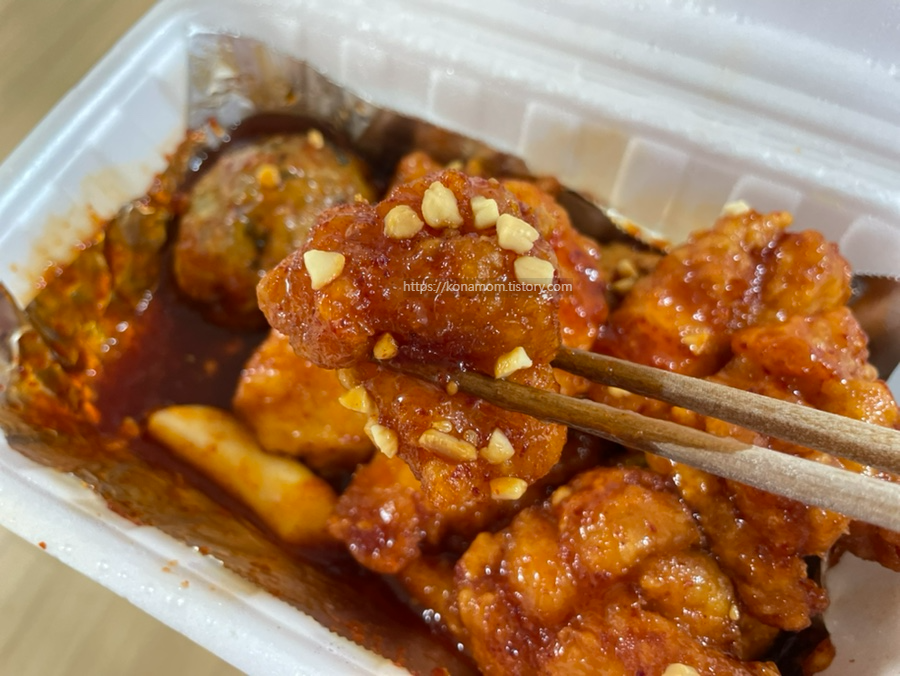 튀김옷만 두꺼운 닭강정도 많은데, 고기도 퍽퍽살이 아닌 부드러운 살 위주로 있어서 맥주 안주로도 좋습니다.