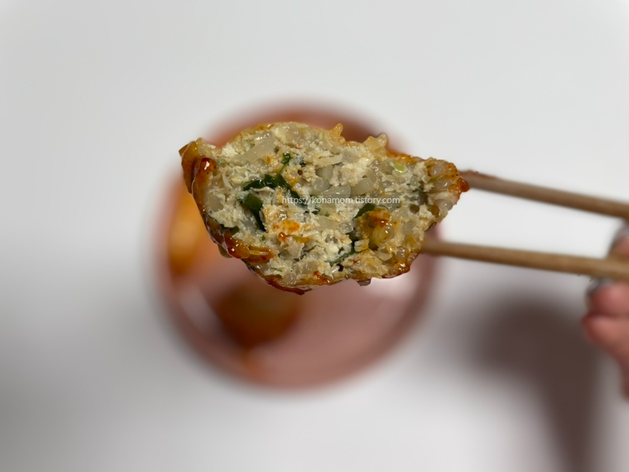 닭강정 소스와 같이 먹으면 또 색다른 맛입니다. 속이 꽉 차 있어서 반 잘라서 소스 묻혀서 같이 먹는데, 피가 워낙 얇아서 속은 촉촉하고 당면, 고기 씹히는 맛이 좋습니다.