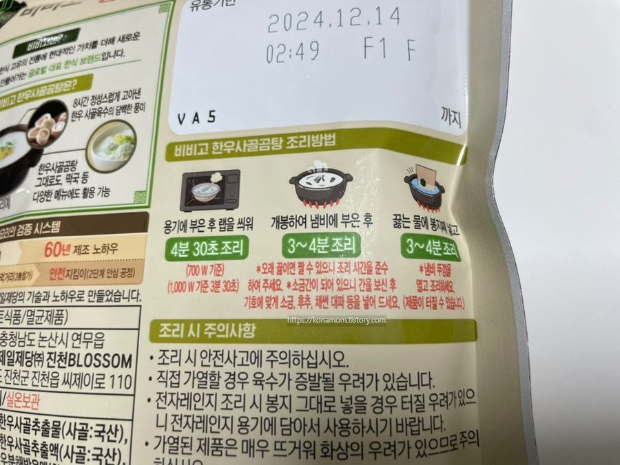 비비고 한우사골곰탕 조리방법은 용기에 부어서 랩을 씌워 조리하거나, 개봉하여 냄비에 부어 끓이거나, 여행지에서 이용할 땐 끓는 물에 봉지째 넣고 끓이는 방법도 있습니다.