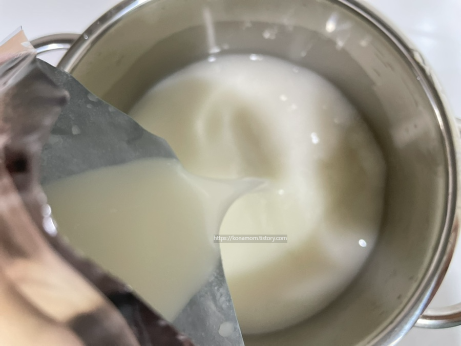 저는 집에서 먹을 거라서 개봉해섯 냄비에 부어서 끓였습니다.