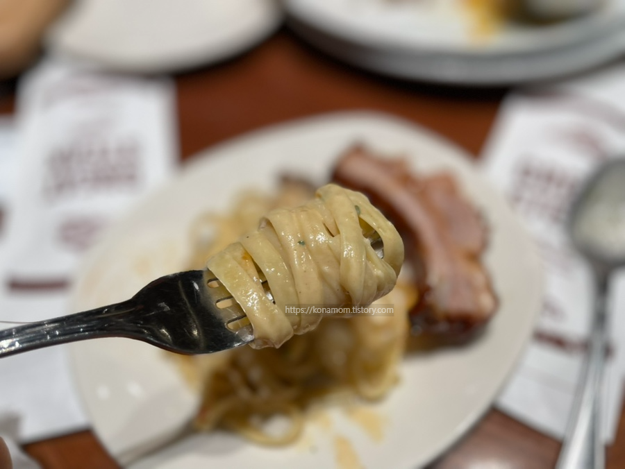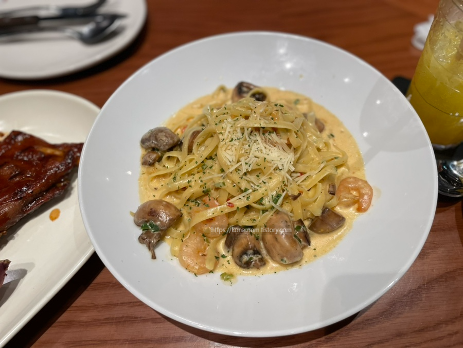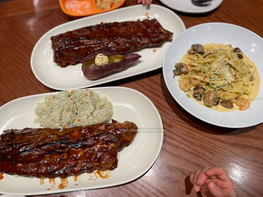베이비백립은 사이드로 볶음밥, 고구마를 선택했고 같이 주문한 투움바 파스타도 나왔습니다.