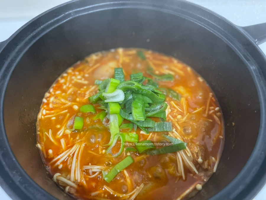 마무리는 팽이버섯, 대파도 넣었는데, 없으면 생략해도 되지만 있으면 더 맛있게 드실 수 있습니다.