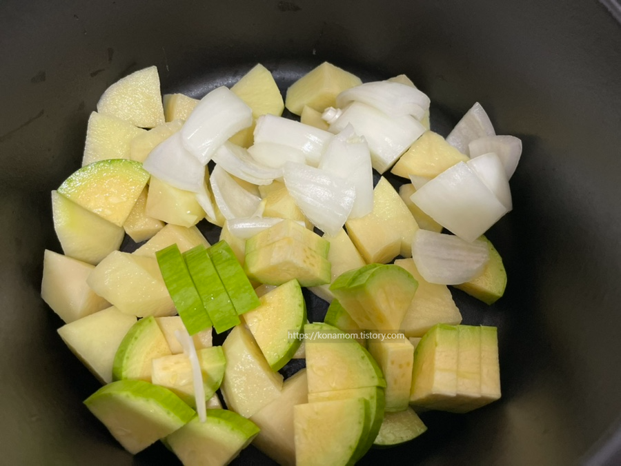 짜글이는 특히나 감자, 애호박 필수죠! 그리고 양파도 있어서 넣었습니다.