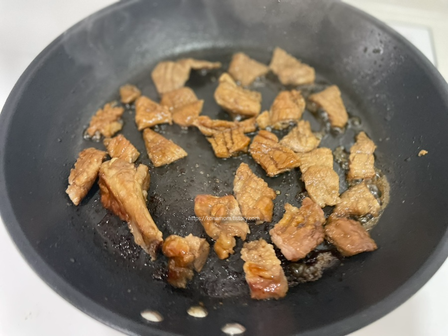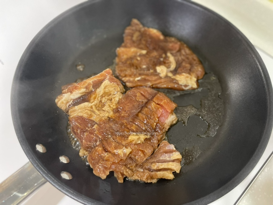 국물이 아깝지만 국물을 넣으면 더 짜진다고 합니다. 국물 없이 고기만 넣고 구워줍니다.