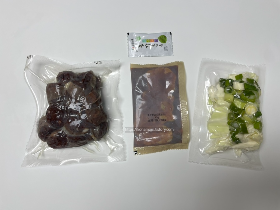 구성은 순대, 들기름, 순대볶음 양념, 야채(양배추, 대파)가 들어가 있습니다.