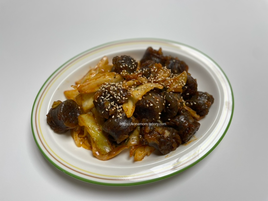 팬에 순대를 넣고 중불로 2분간 더 볶아준 뒤 양념을 넣고 중불로 1분간 더 볶아 줍니다.