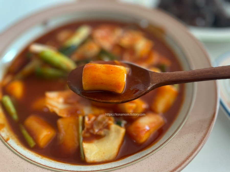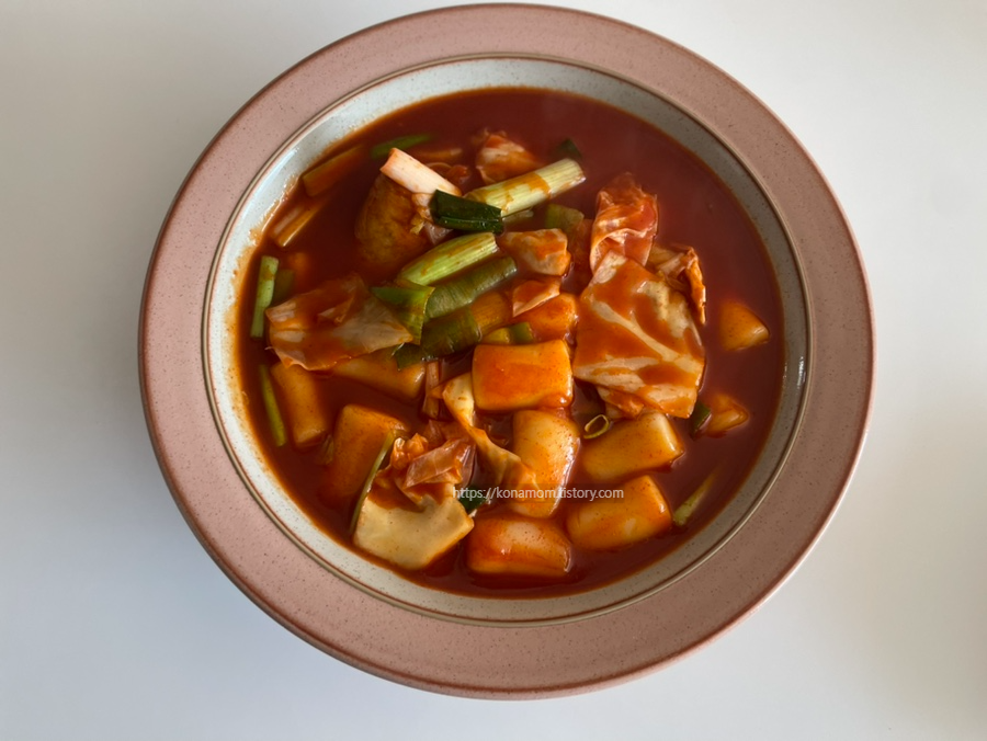 4분 30초 5분간 끓여 주면 되는데, 쌀떡이다 보니 눌어붙을 수 있으니 잘 저어주시면 됩니다. 냉장고에 대파와 양배추가 있어서 더 넣었더니 더 맛있었습니다. 달걀이나 라면사리 등 개인 취향에 맞게 넣어서 드시면 좋을 것 같습니다.