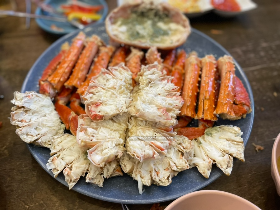 그리고 킹크랩, 대개가 나왔습니다. 저희는 두 테이블에 나눠서 내서 한 접시에 이만큼 담아졌는데, 엄청 푸짐했습니다.