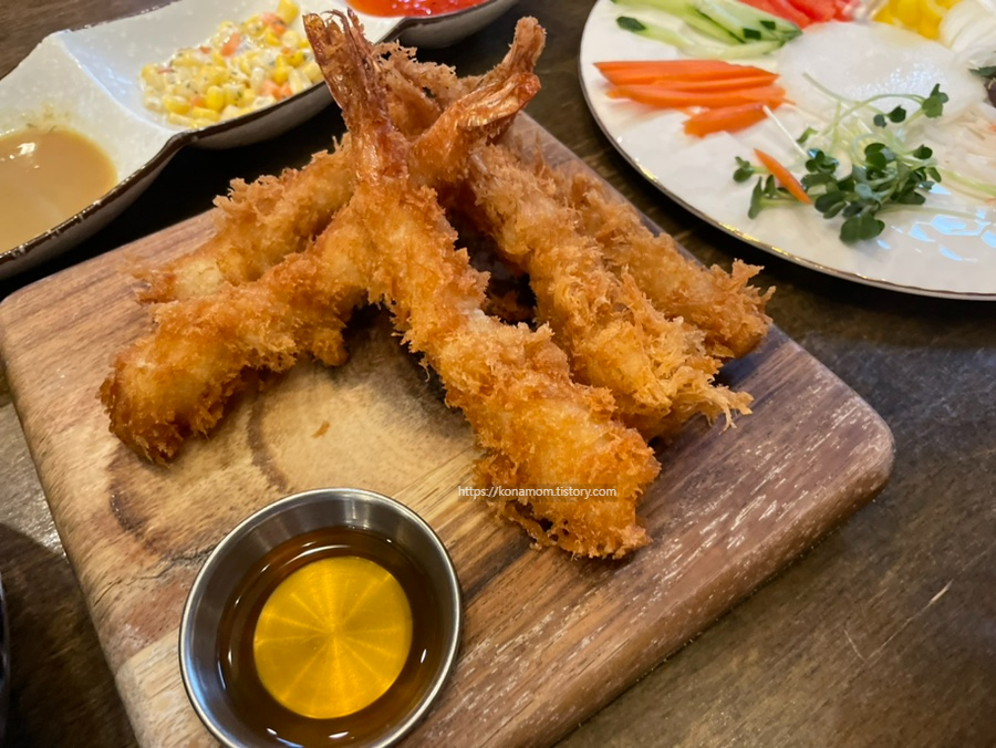 바삭한 새우튀김은 인원수대로 나오는데, 갓 튀겨서 나와서 정말 바삭하고 따뜻합니다. 맥주 안주로 최고!