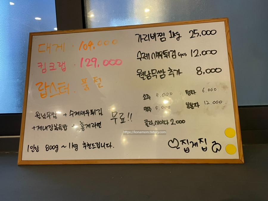 메뉴는 대게, 킹크랩, 랍스터가 있는데, 이 날은 랍스터가 품절이었고 대게, 킹크랩 랍스터는 시가 기준으로 가격 변동이 있는 듯합니다. 그 외 가리비찜이나 새우튀김 쌈야채 추가로 주문하셔서 드실 수 있으나 대게, 킹크랩 주문하시면 기본으로 월남무쌈, 수제새우튀김, 게내장볶음밥, 홍게라면이 무료로 나옵니다.