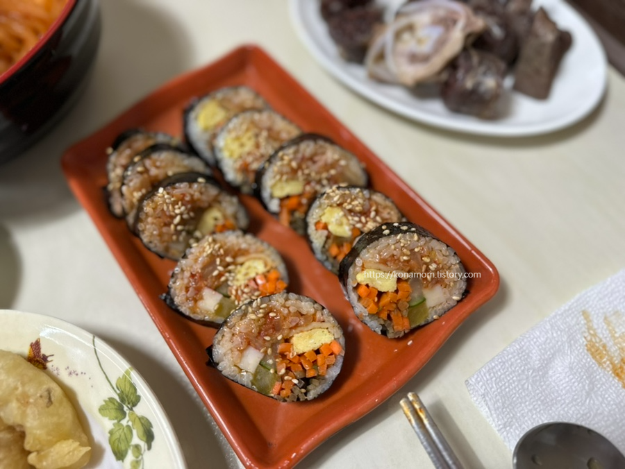 씹을수록 시원하고 식감이 좋아서 저는 수봉분식 가면 무조건 포장해서 오는 김밥인데, 참치김밥도 고소하고 맛있습니다.