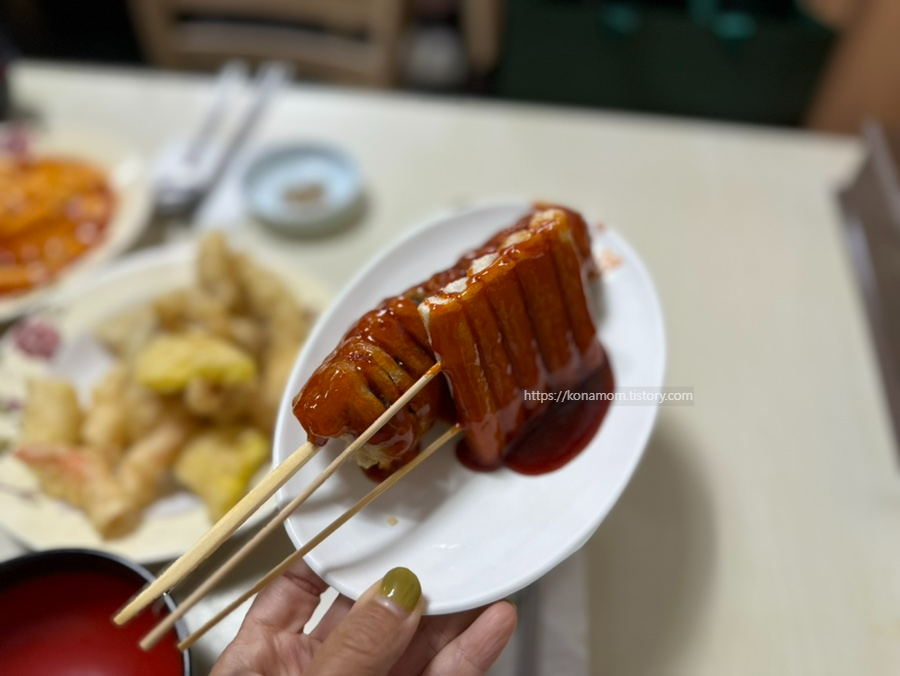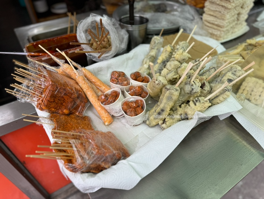 옛날 분식 스타일 피카츄도 있고 튀김 종류도 다양하게 있는데, 여기 순대꼬치가 정말 맛있습니다.