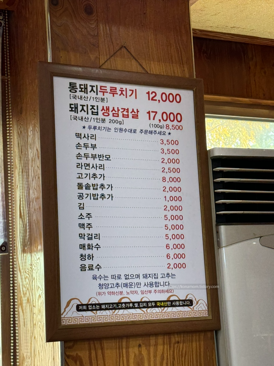 돼지집 메뉴는 통돼지 두루치기와 생 삼겹살이 주 메뉴이고 추가사리, 밥, 주류, 김 등을 추가로 주문하실 수 있습니다.