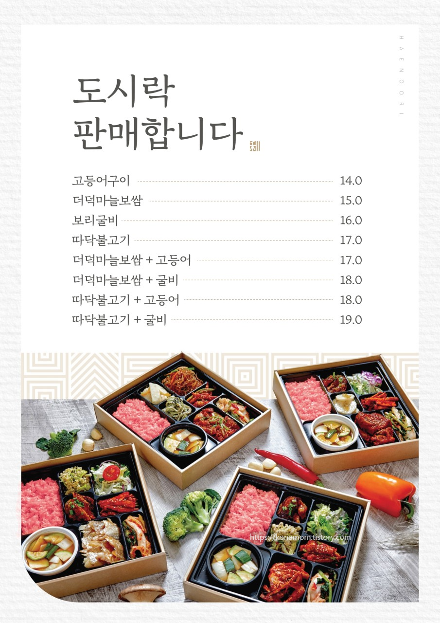 분당 한정식 해누리 분당점 메뉴는 정식 메뉴들이 있고 단품으로 해누리식 전복우채, 더덕마늘보쌈, 고등어그릴구이/1미, 보리굴비/1미, 서해꽃게장/양념, 제주황게장/간장, 직화바싹불고기도 추가로 주문하실 수 있습니다. 그리고 포장으로 도시락 포장 구입도 가능하니 점심메뉴나 모임 시 주문하셔도 괜찮을 것 같습니다.