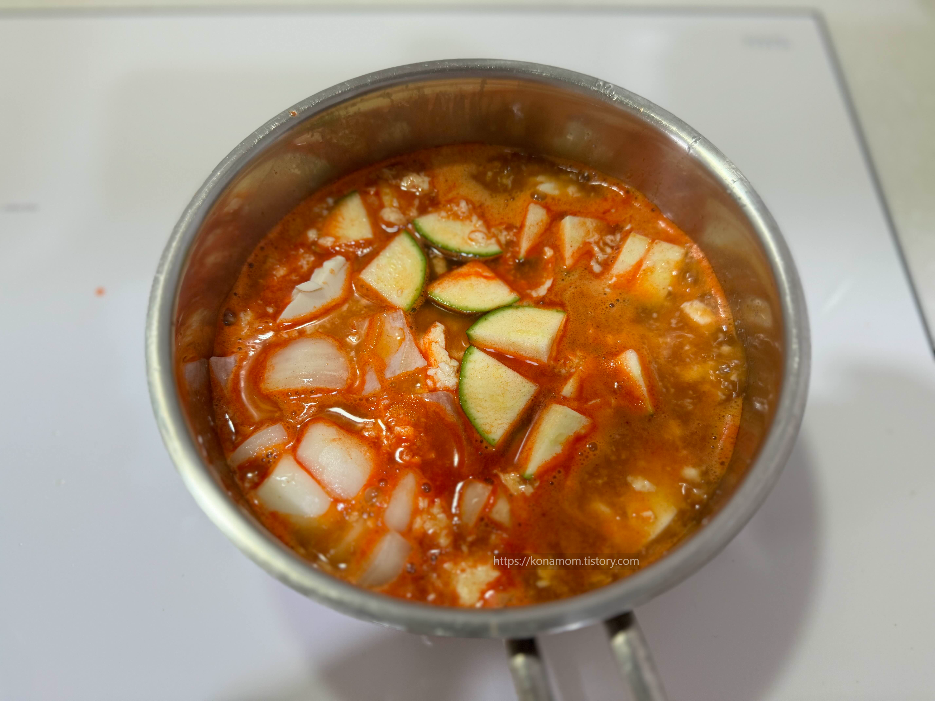 냉장고에 호박, 양파가 있어서 더 넣어 줬는데, 확실히 야채가 많으면 더 맛있는 것 같습니다.(저는 좀 싱겁게 먹는 편이라 물을 추가로 더 넣었습니다. 개인간에 따라 조절하시면 될 것 같습니다.)