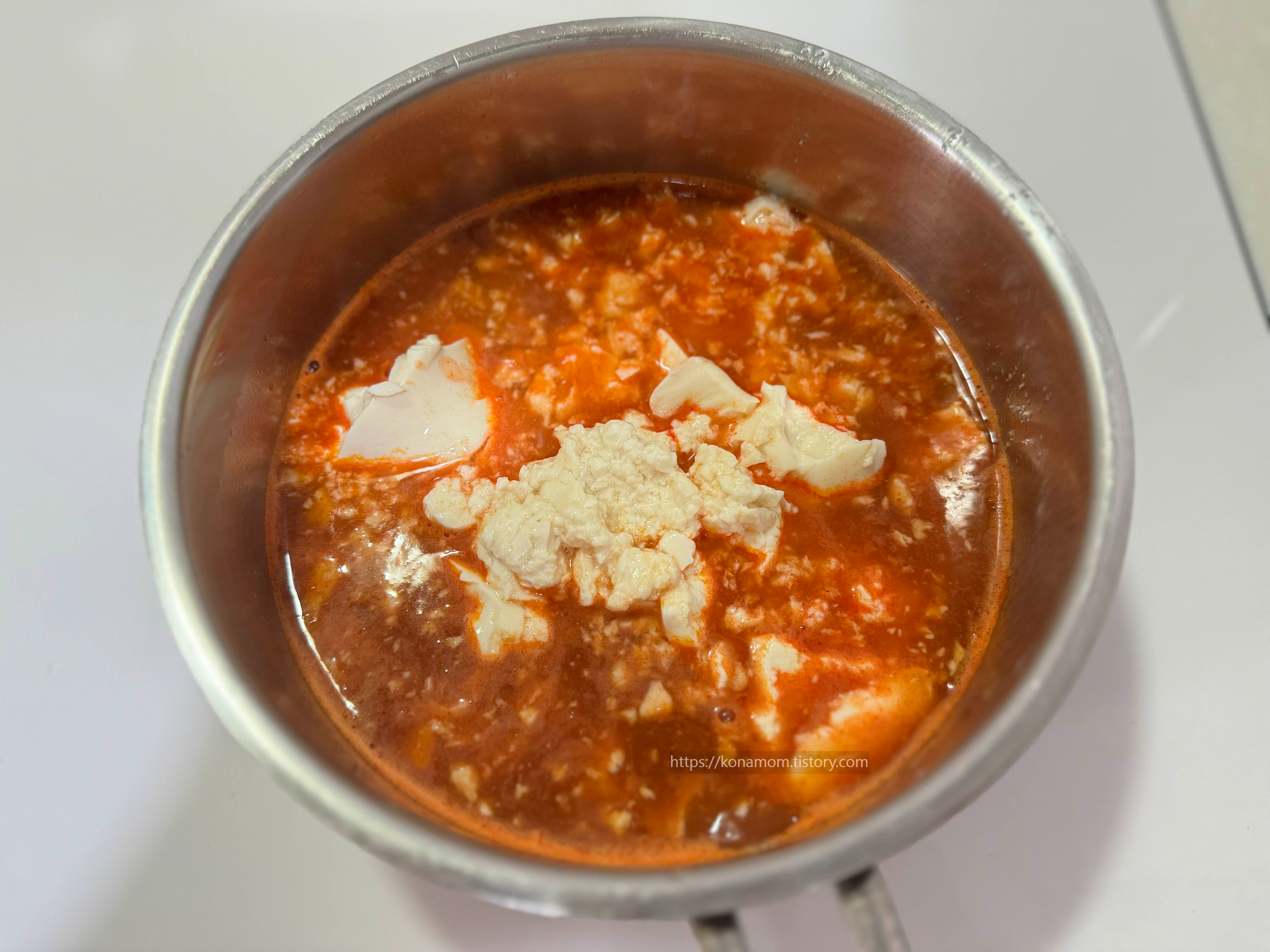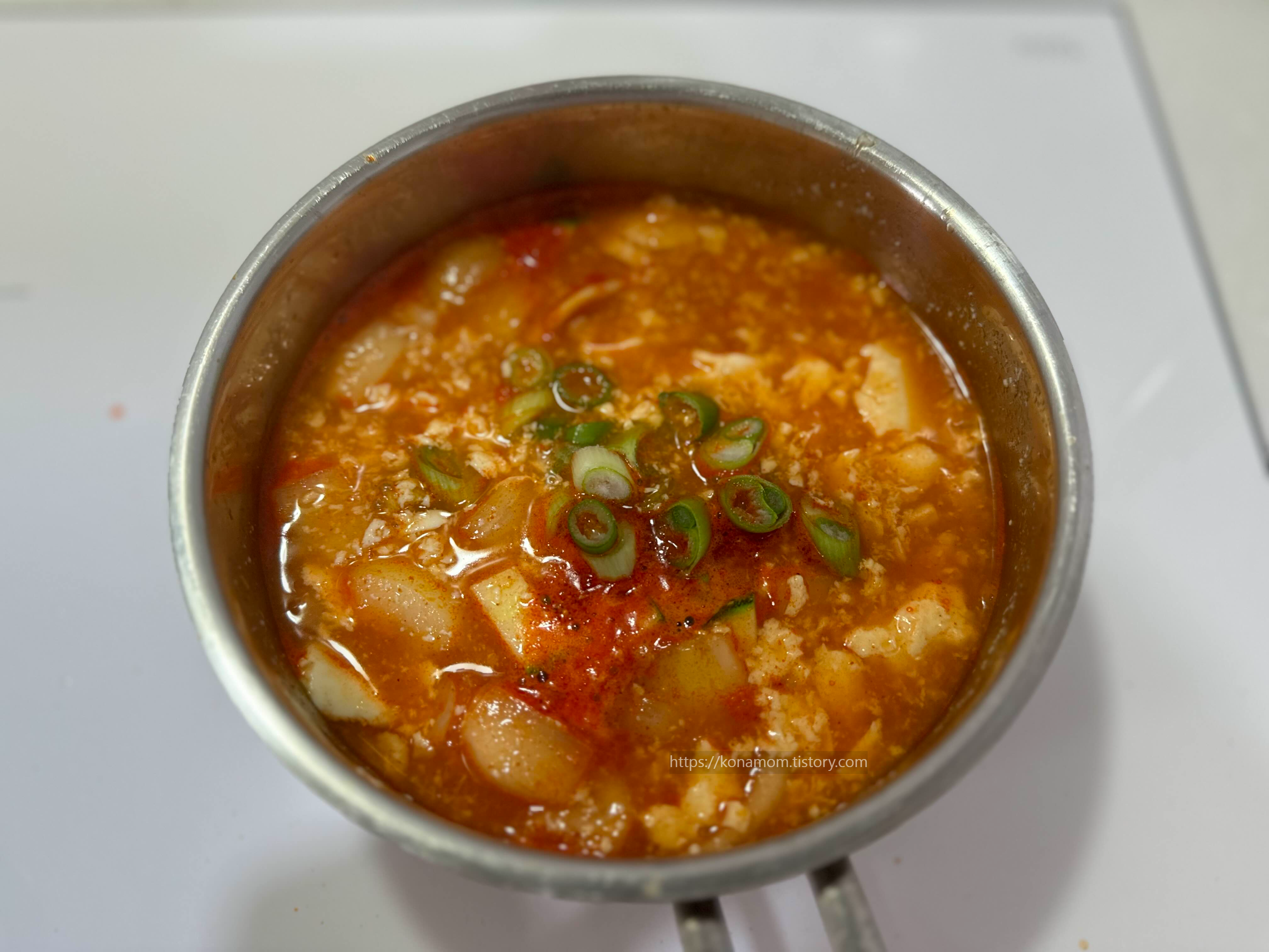 냄비에 육수와 양념장 넣고 끓으면 순두부 넣고 3분 30초만 더 끓이면 완성!