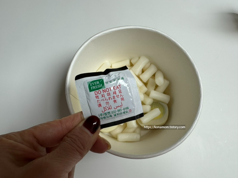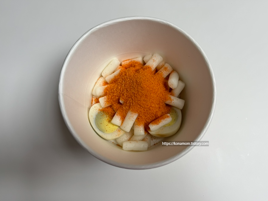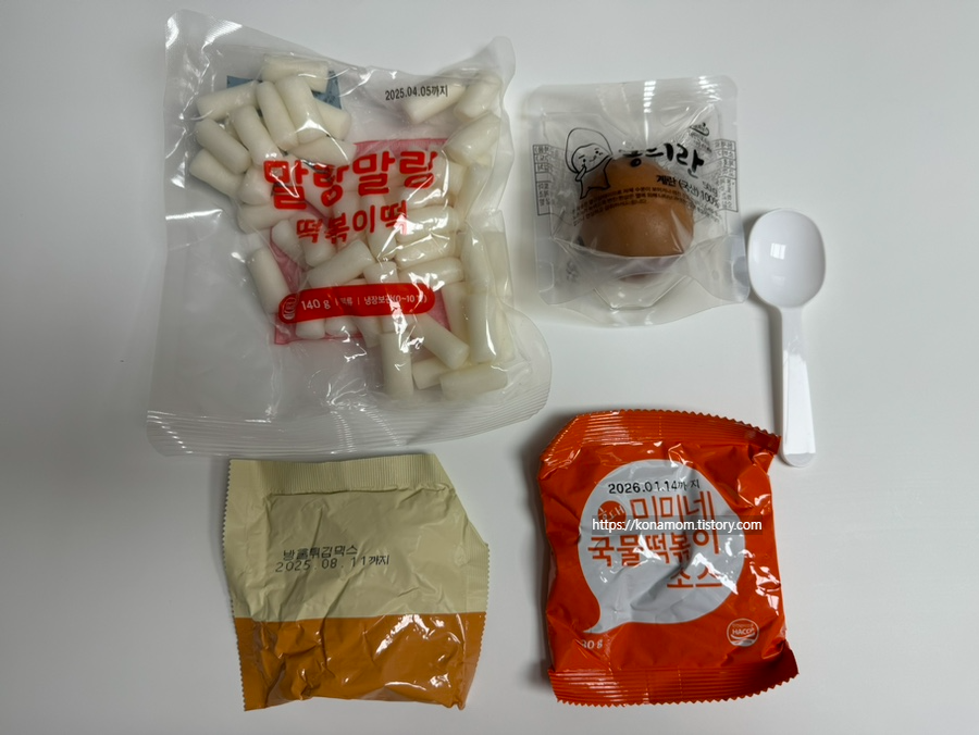 떡, 달걀, 방울튀김믹스, 떡볶이 소스가 들어가 있고 스푼도 하나 있습니다.