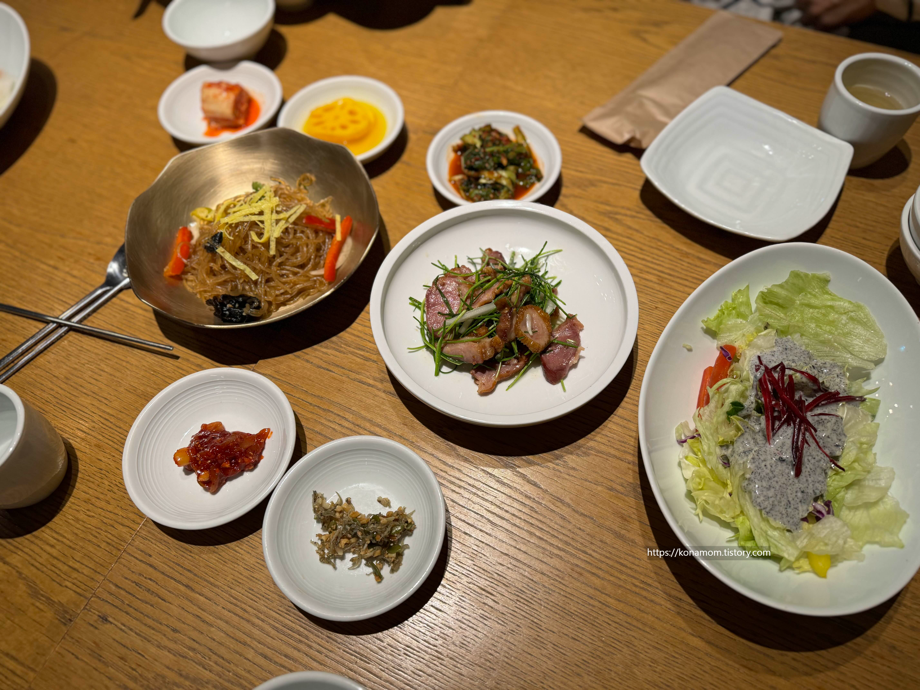 기본 찬으로 잡채, 오리고기도 같이 나오고 밑반찬과 샐러드가 나옵니다.
