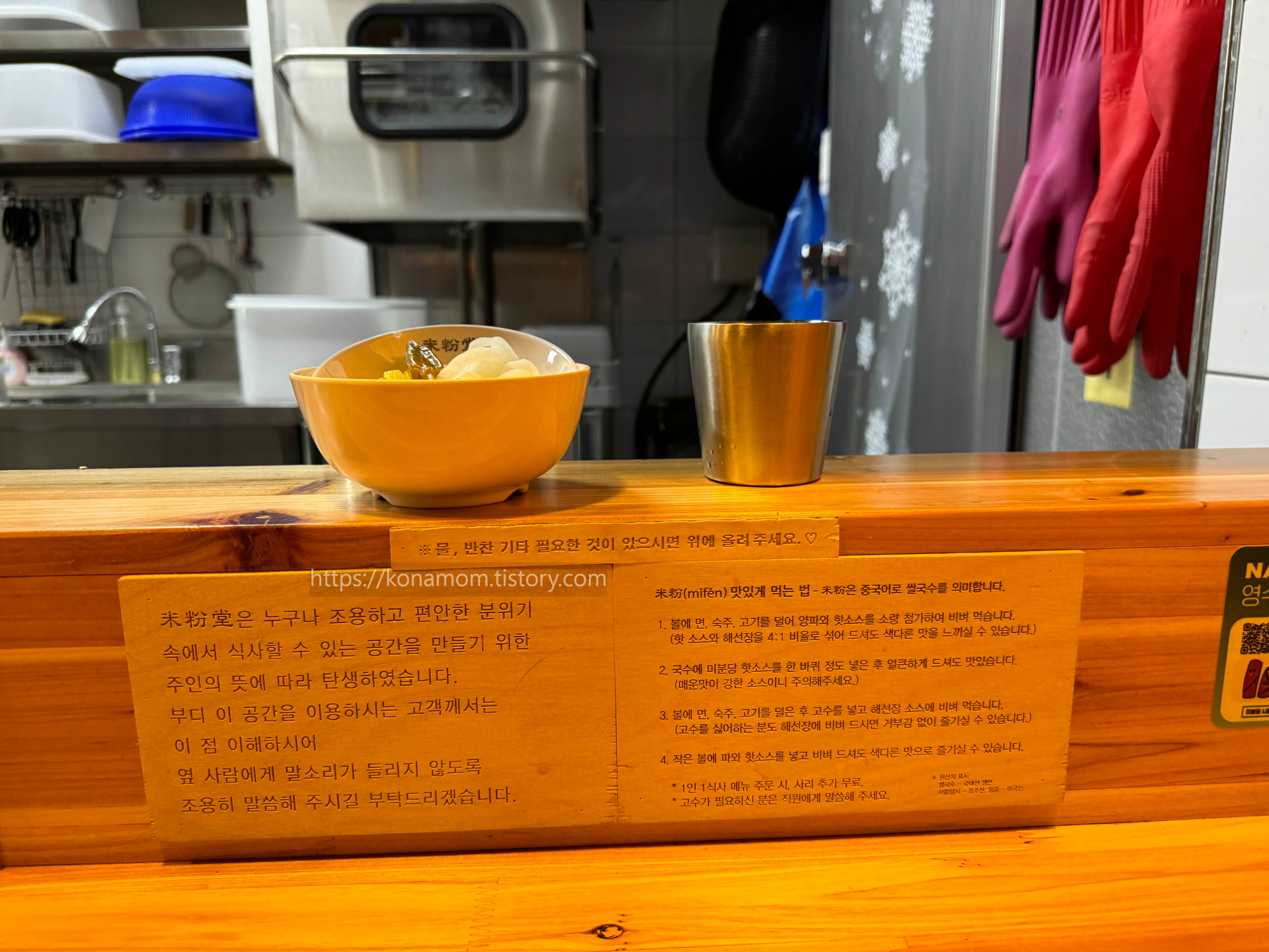 저는 맨 안쪽에 앉았는데, 조용하게 식사 할 수 있는 곳이라는 안내와 시흥쌀국수맛집 미분당 쌀국수 맛있게 먹는 법이 안내되어 있습니다. 1인 1식사 메뉴 주문 시에는 사리 추가 무료이고 고수가 필요하시면 직원분께 따로 말씀드리면 됩니다.