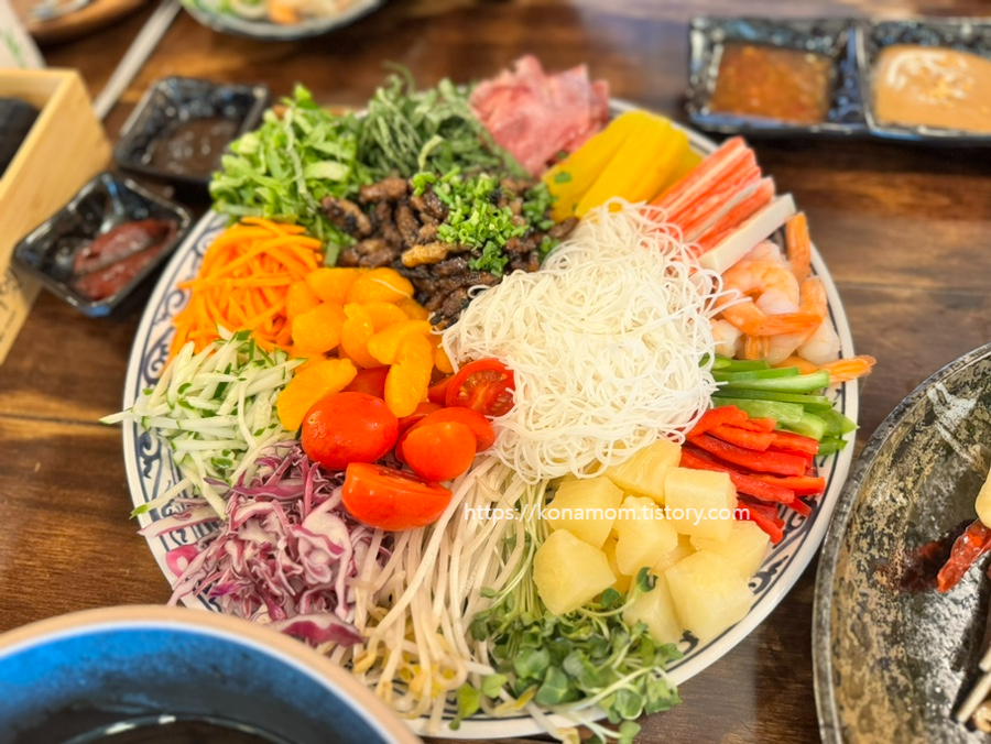 월남쌈이 정말 푸짐하게 나왔습니다. 색도 예쁘고 재료도 다양해서 건강한 음식 먹고 온 기분이 들었습니다.