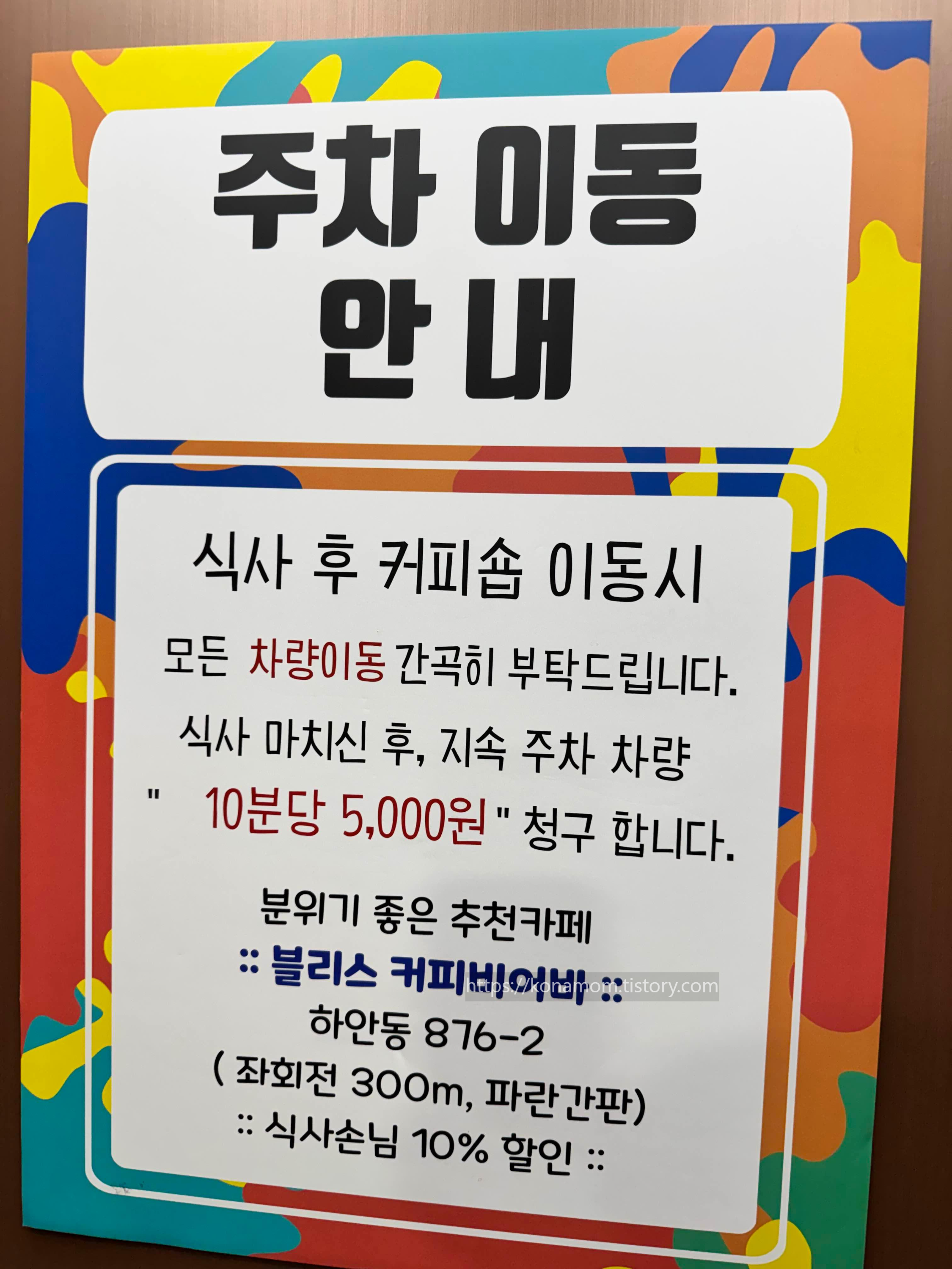 식사 마치신 후 차량이동 안 하시면 주차요금 청구될 수 있으니 주의하시는 게 좋을 것 같습니다.