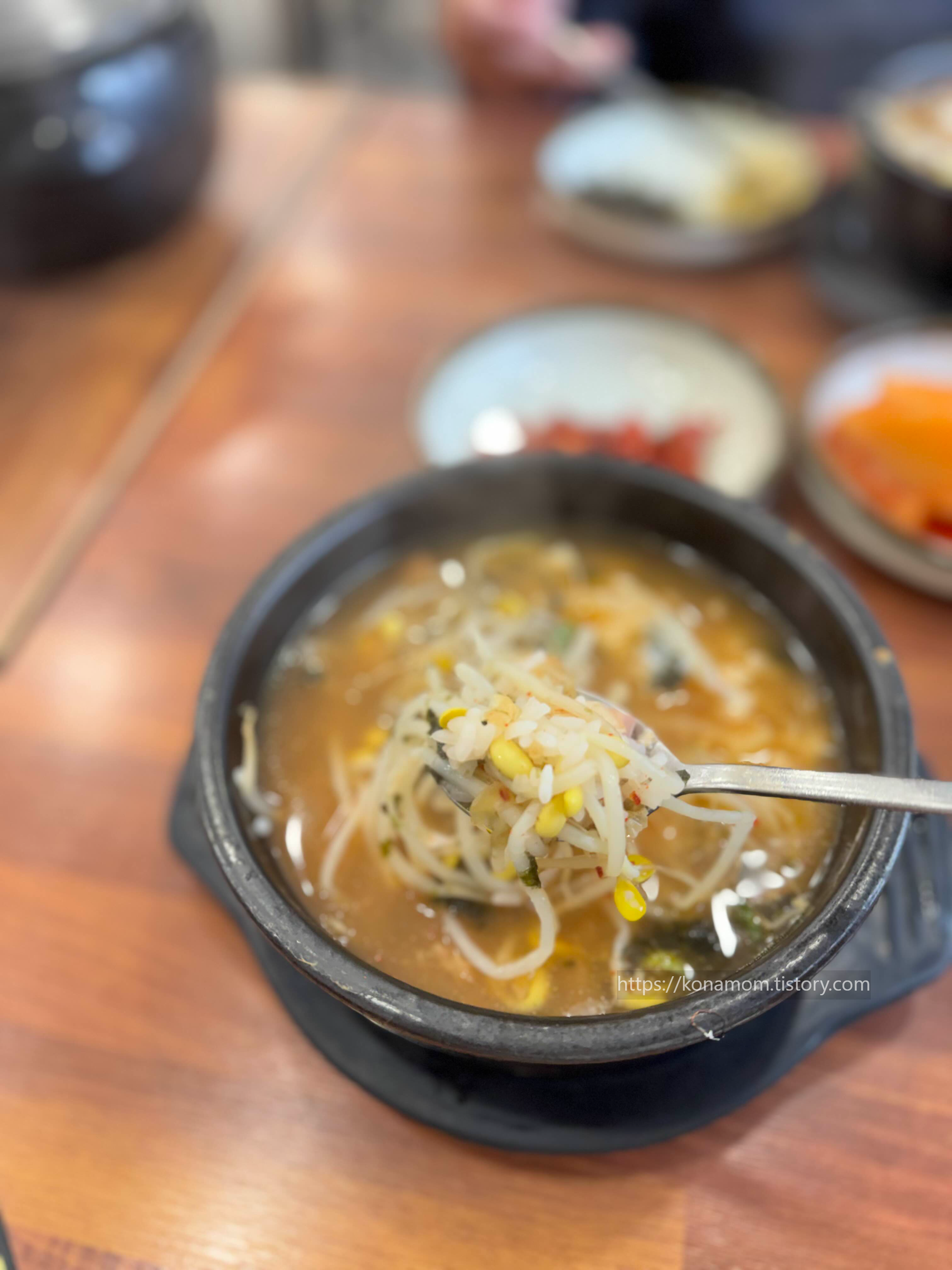 토렴된 밥알은 물에 적셔져 지나치게 퍼지지도, 딱딱하지도 않은 부드러운 밥알이 콩나물의 아삭함과 대비되며 입안을 든든하게 채워줍니다.