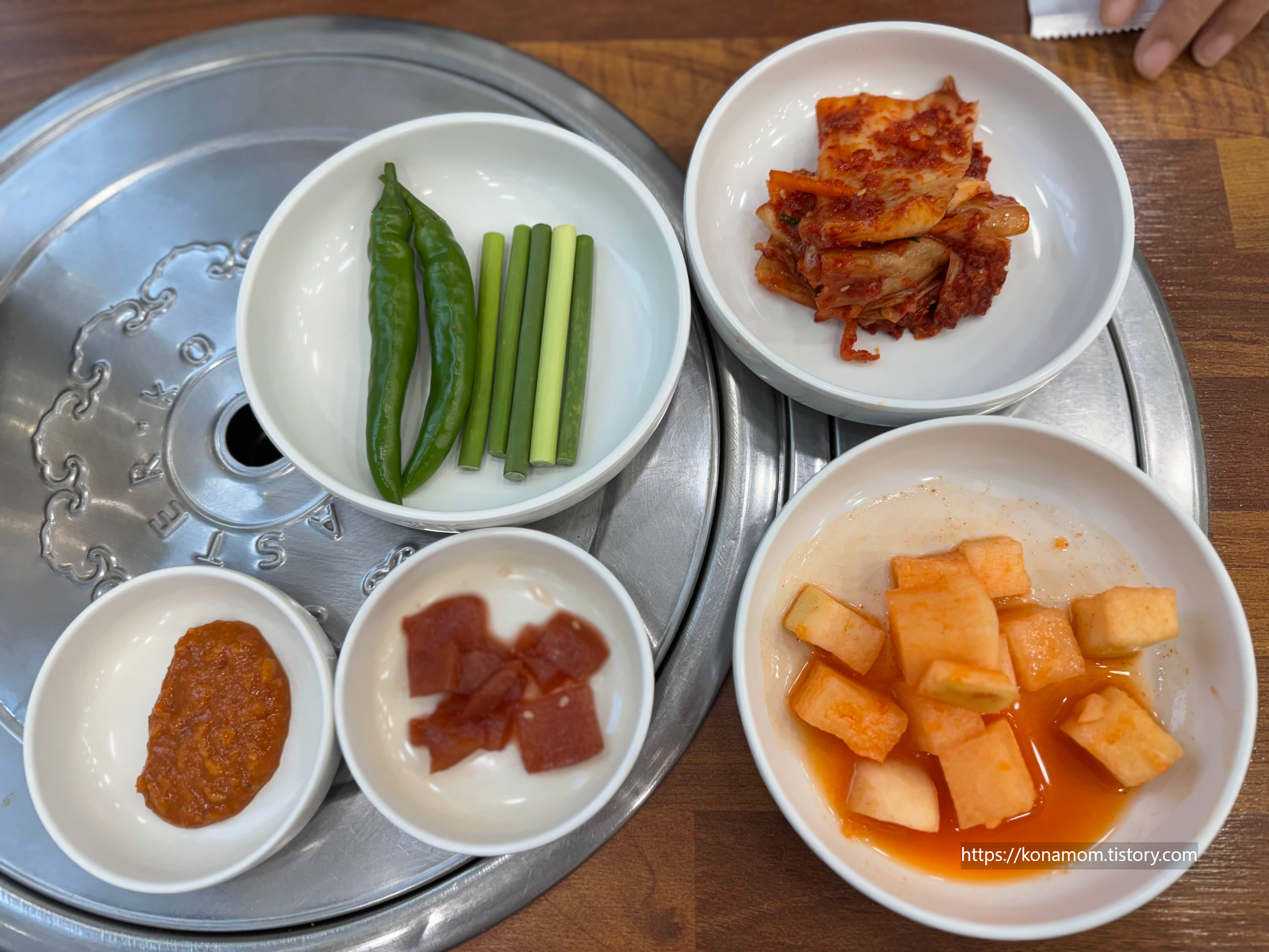고추, 마늘쫑, 배추김치, 무절임, 깍두기, 쌈장이 나옵니다.