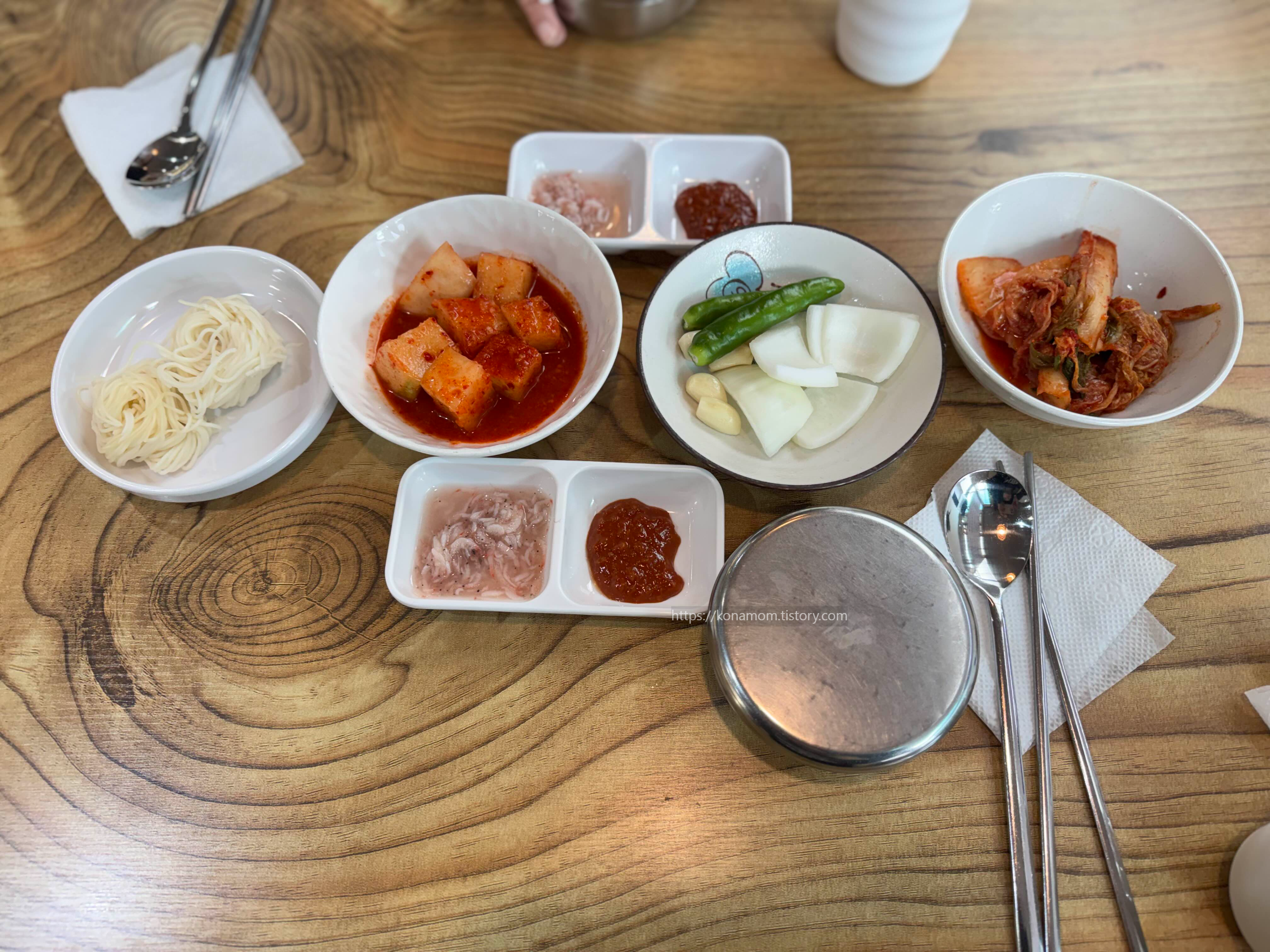 기본 찬은 깍두기와 김치가 나오고, 쌈장, 새우젓갈, 고추, 마늘, 양파가 같이 나옵니다. 소면은 국밥에 넣어서 드시면 됩니다.