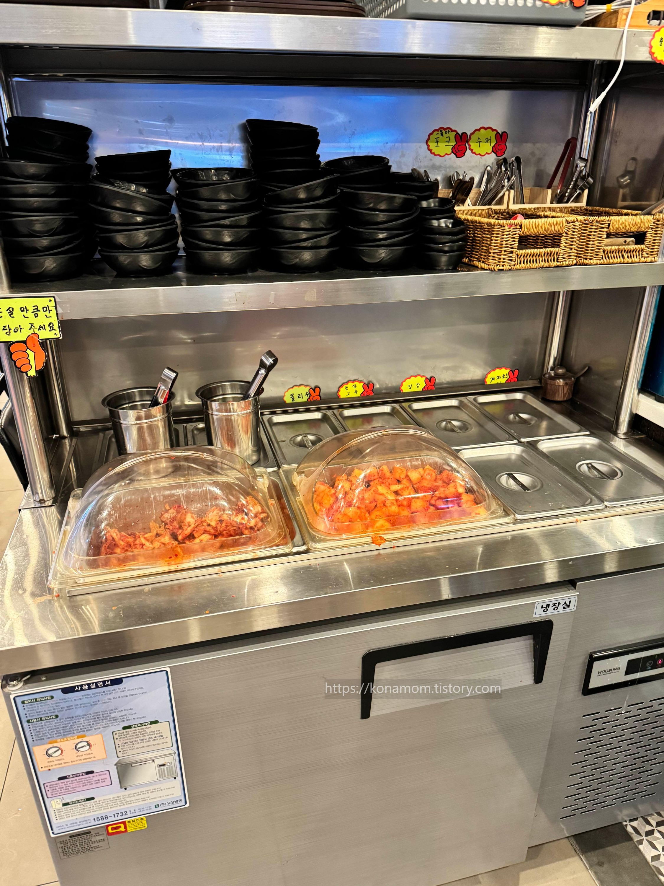 셀프바에는 앞접시와 김치, 깍두기가 준비되어 있습니다.