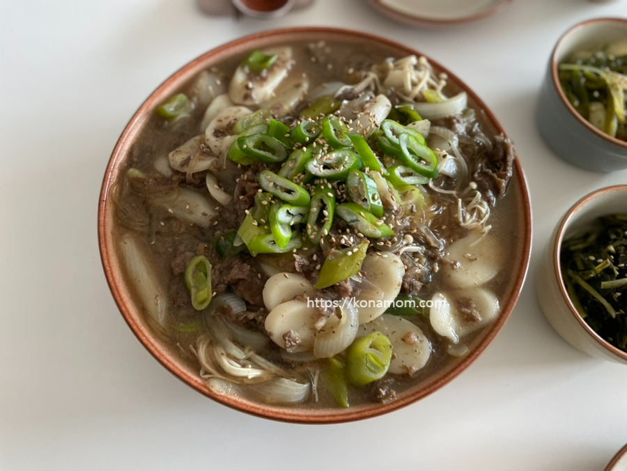 집에 친정에서 보내주신 맛있는 떡국떡이 있어서 욕심에 너무 많이 넣었나 봐요. 그리고 국물을 다 넣었더니 찌개 같은 느낌도 있어요.