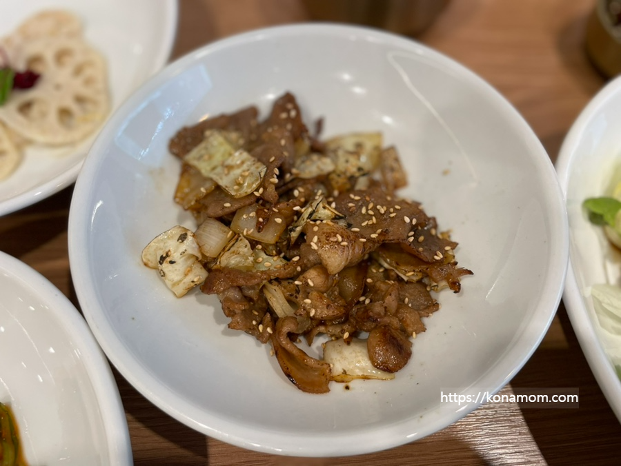 아이가 좋아하는 간장 돼지불고기도 정식에 포함되어 나옵니다. 양파, 양배추도 같이 들어가 있는데, 살짝 불향이 나면서 단짠인데, 고기가 얇아서 양념이 잘 배어 있어서 밥반찬으로 좋았어요.