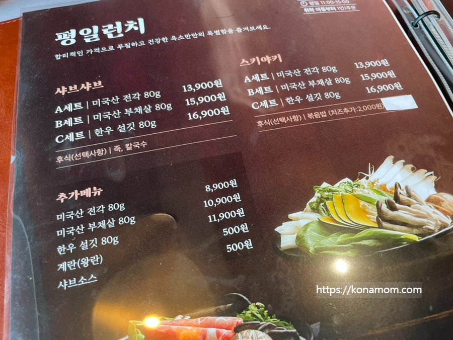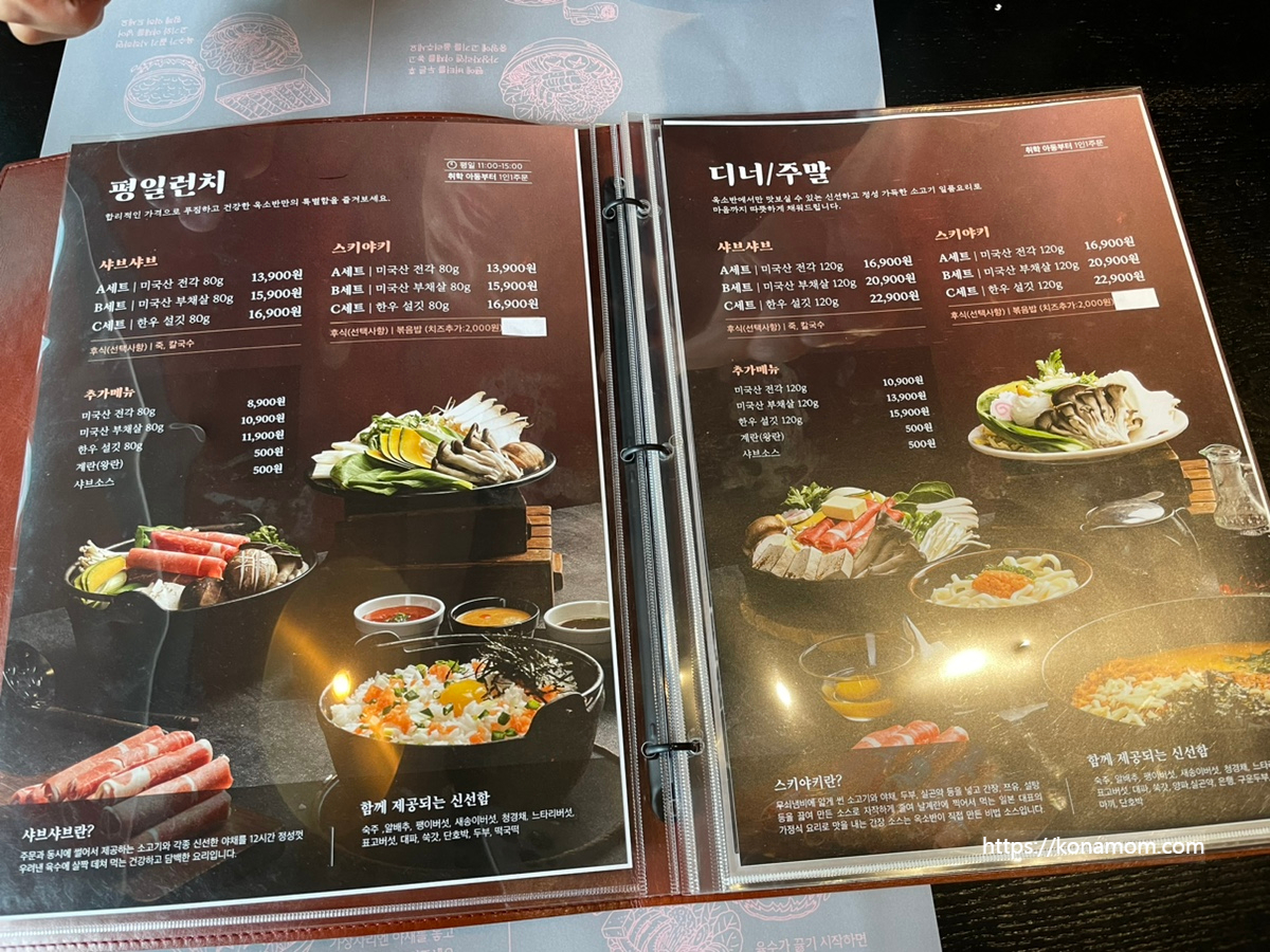 메인메뉴 샤브샤브와 스키야키를 기본으로 하고 고기나 다른 것을 추가해서 드실 수 있어요.