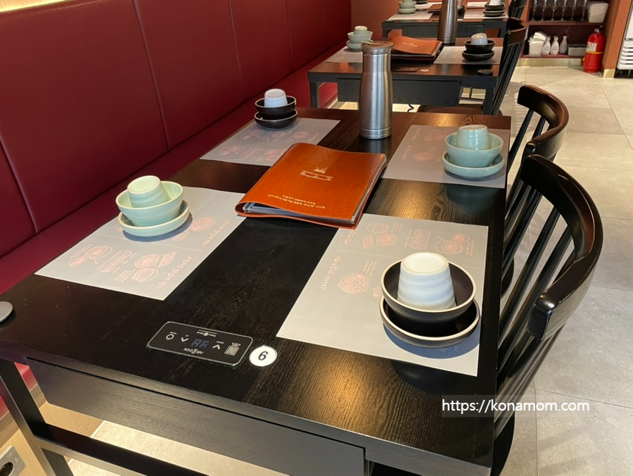 기본 테이블 세팅이 되어 있었고 수저, 티슈는 테이블 서랍을 열면 있습니다.