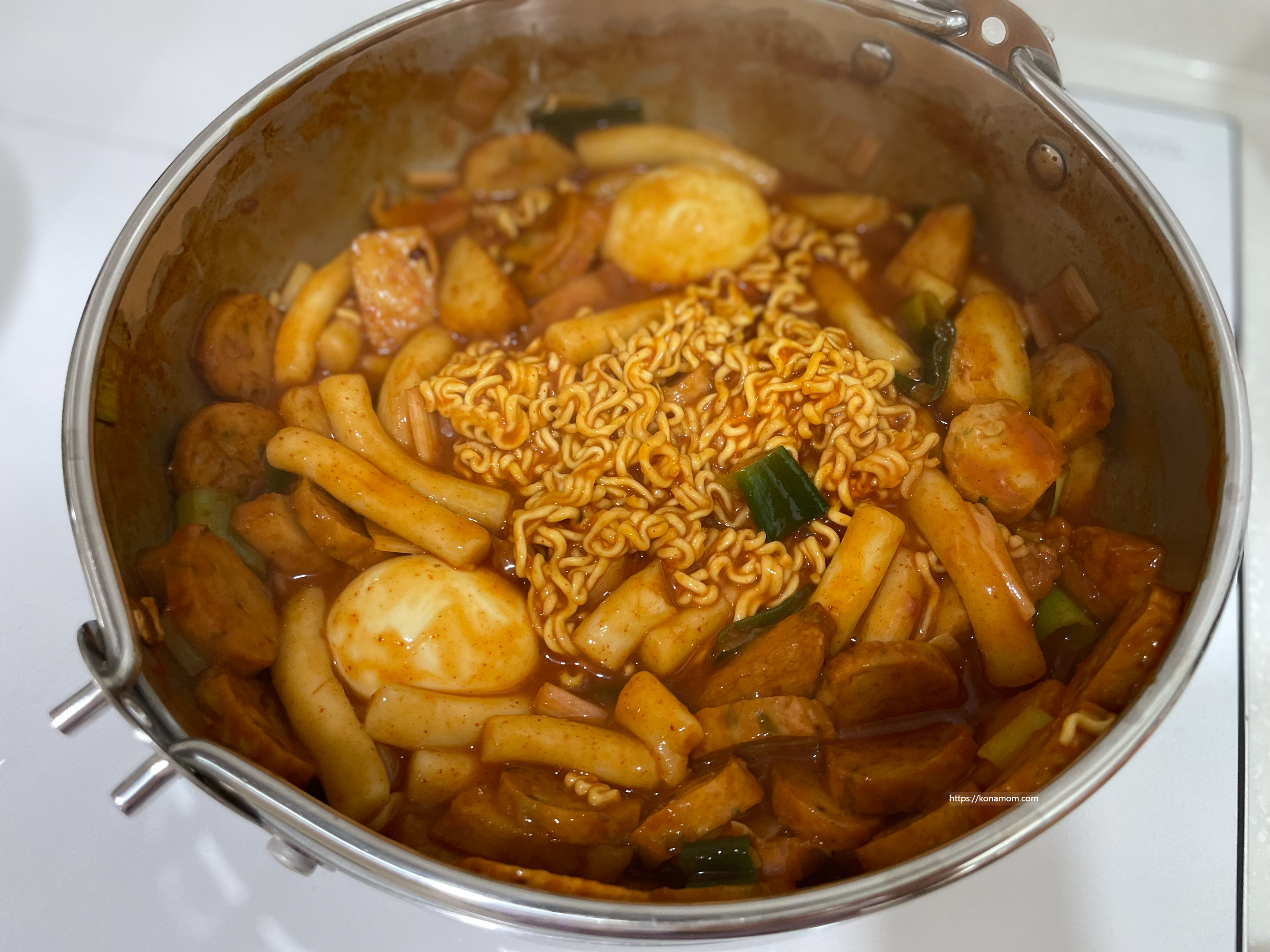 재료 추가 없이 떡과 어묵만으로 먹는 것이 원래 맛을 느끼기에 가장 좋다고 하는 말을 마켓컬리 홈페이지에서 뒤늦게 봤습니다. 여러 가지 사리를 많이 추가하면 국물 맛이 연해질 수 있으니 완성된 떡볶이 위에 깻잎과 대파 정도의 고명만 올리는 것을 추천한다고 합니다. 저는 떡볶이엔 무조건 라면사리 꼭 넣어야 하다 보니 잘 읽어 보지도 않고 넣는 바람에 국물이 거의 없어졌는데, 나름 맛있게 먹었어요.(간편식 떡볶이는 즉석 떡볶이가 아니니 사리는 최소화 하라고 합니다.)