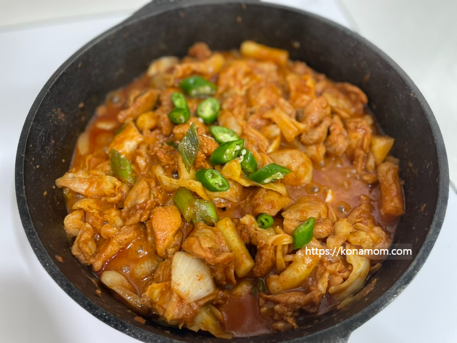 닭갈비 소스만으로도 매콤하지만 청양고추를 넣었더니 매콤함이 한층 더 올라와 깔끔하게 먹었습니다.