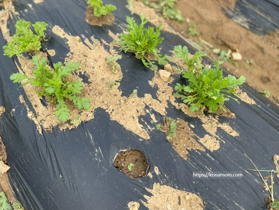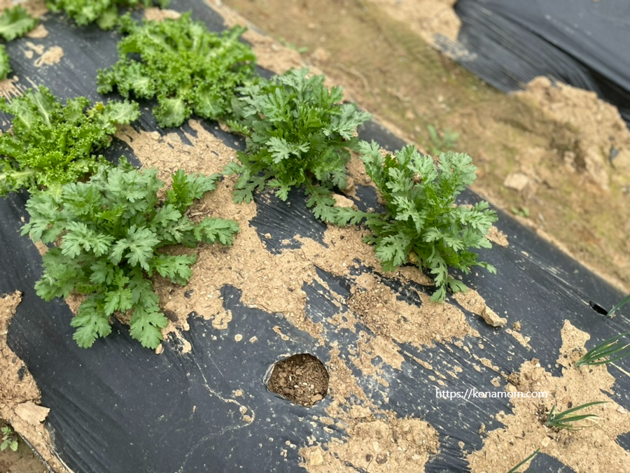 텃밭 작물 쑥갓은 모종으로 구입해서 심었어요. 쑥갓 모종은 4월에 종묘사에 가시면 구하실 수 있어요.