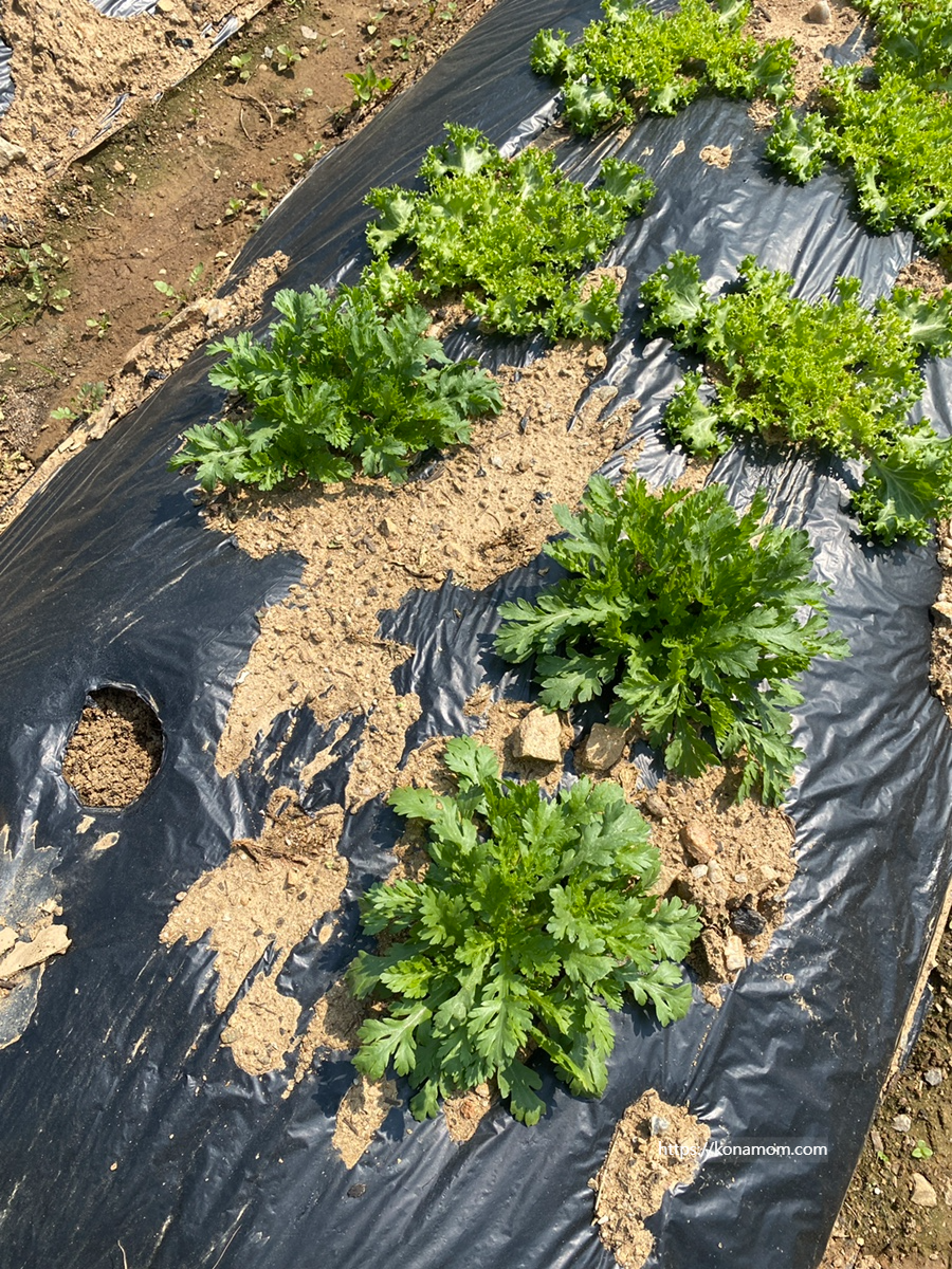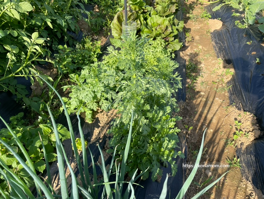 주말농장을 하고 있다 보니 자주 가지 못해서 갈 때마다 조금씩 수확하고 있는데요, 쑥갓 같은 경우에는 모종으로 심으면 보통 한 달 이내로 조금씩 수확해서 드시면 됩니다.