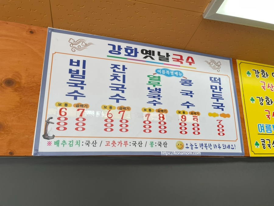 은행동 잔치국수 맛집 강화 옛날국수 메뉴입니다. 시흥 국수 맛집답게 국수 메뉴가 주이고 여름 특별 메뉴도 국수, 그리고 떡만둣국도 있습니다. 원래 맛집은 메뉴가 많지 않은 법이지요. 여러 메뉴 많은 것보다 맛있는 메뉴만 있는 곳이 괜히 더 발길이 가더라고요.