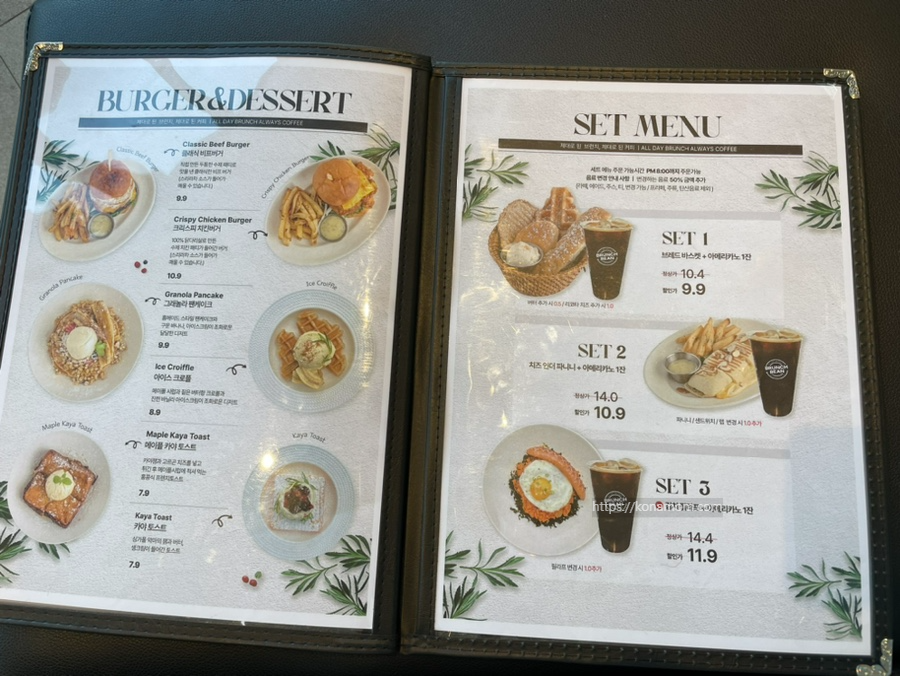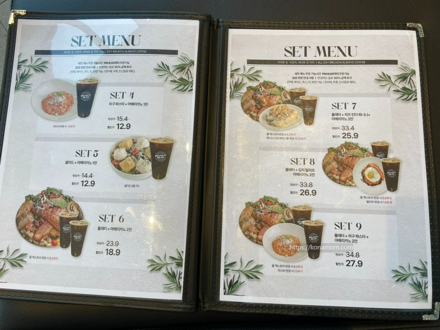 브런치 메뉴부터 샌드위치, 피자, 샐러드 등 다양한 메뉴가 있고 세트 메뉴도 있어서 방문하신 인원에 맞게 주문하시면 될 것 같습니다.