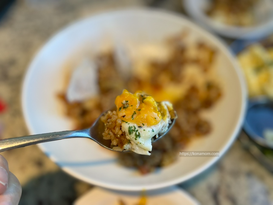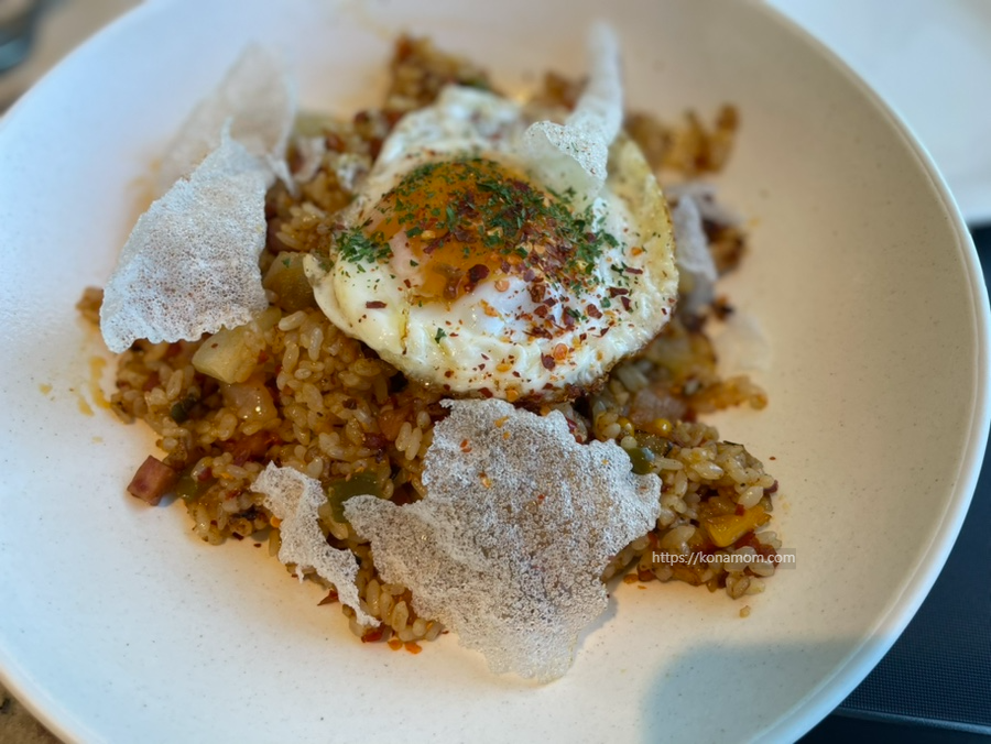 달걀 반숙까지 비벼서 먹으면 김치볶음밥인데, 좀 더 고급 진 맛입니다.