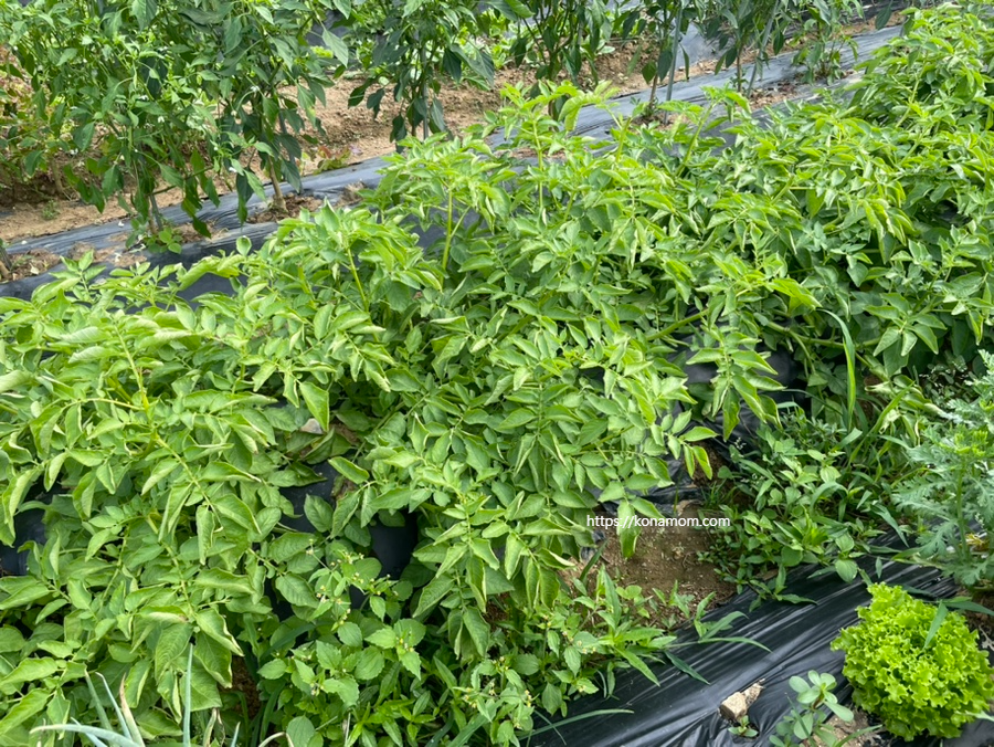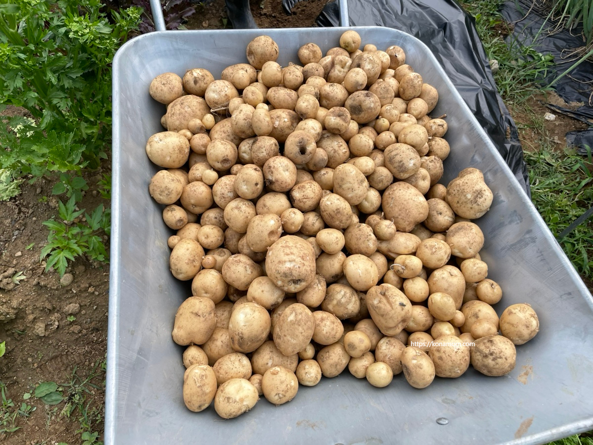감자는 수확까지 기간이 짧은 편이라 봄에 심어서 보통 6월 중순이나 말경에 수확하는데요(7월에 수확하는 감자도 있고 가을에 수확하는 가을감자도 있다고 합니다.), 다음주부터 장마라고 해서 장마가 지나면 감자가 썩을 수 있어서 계획보다 일찍 캐기로 했습니다.